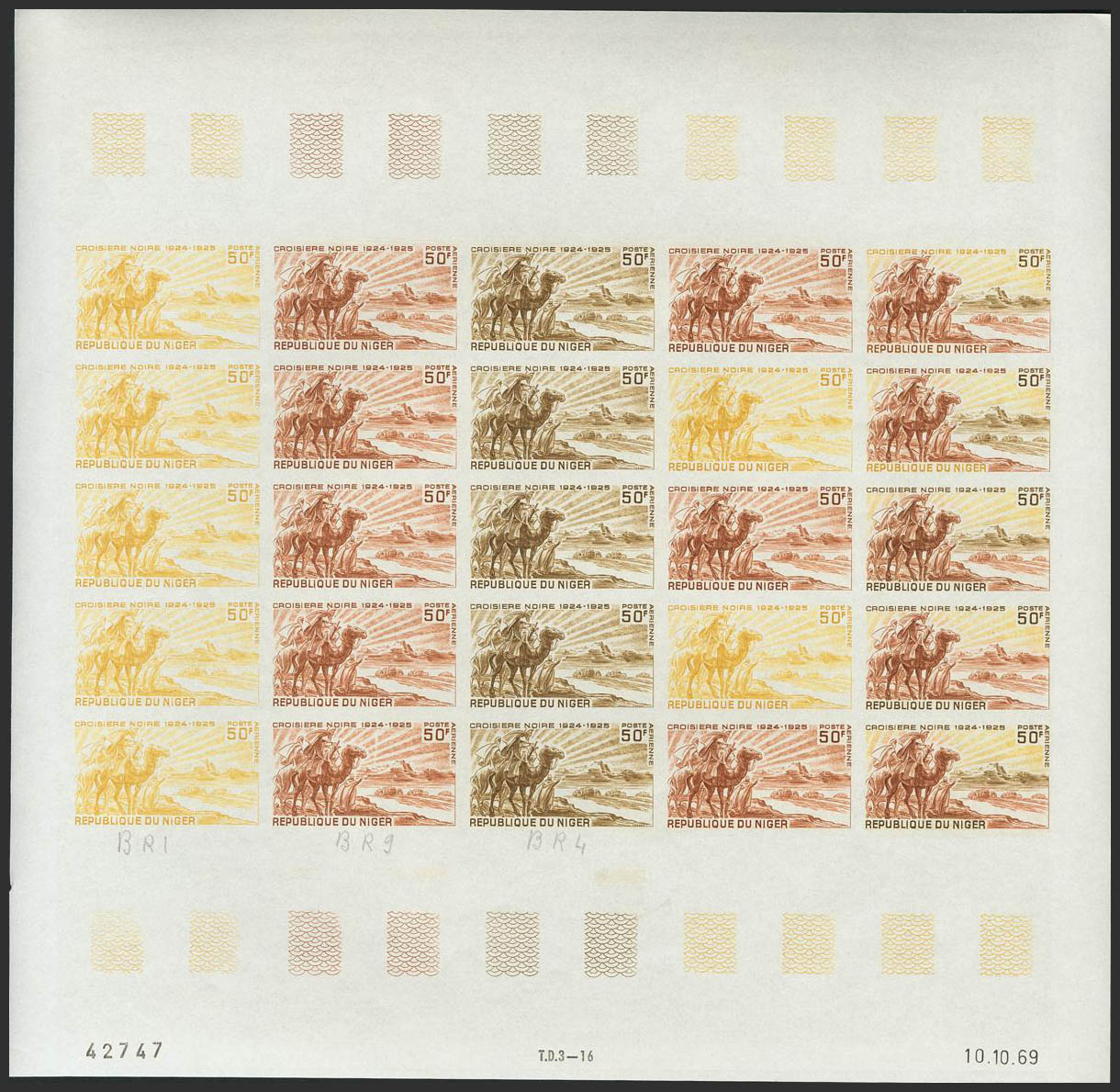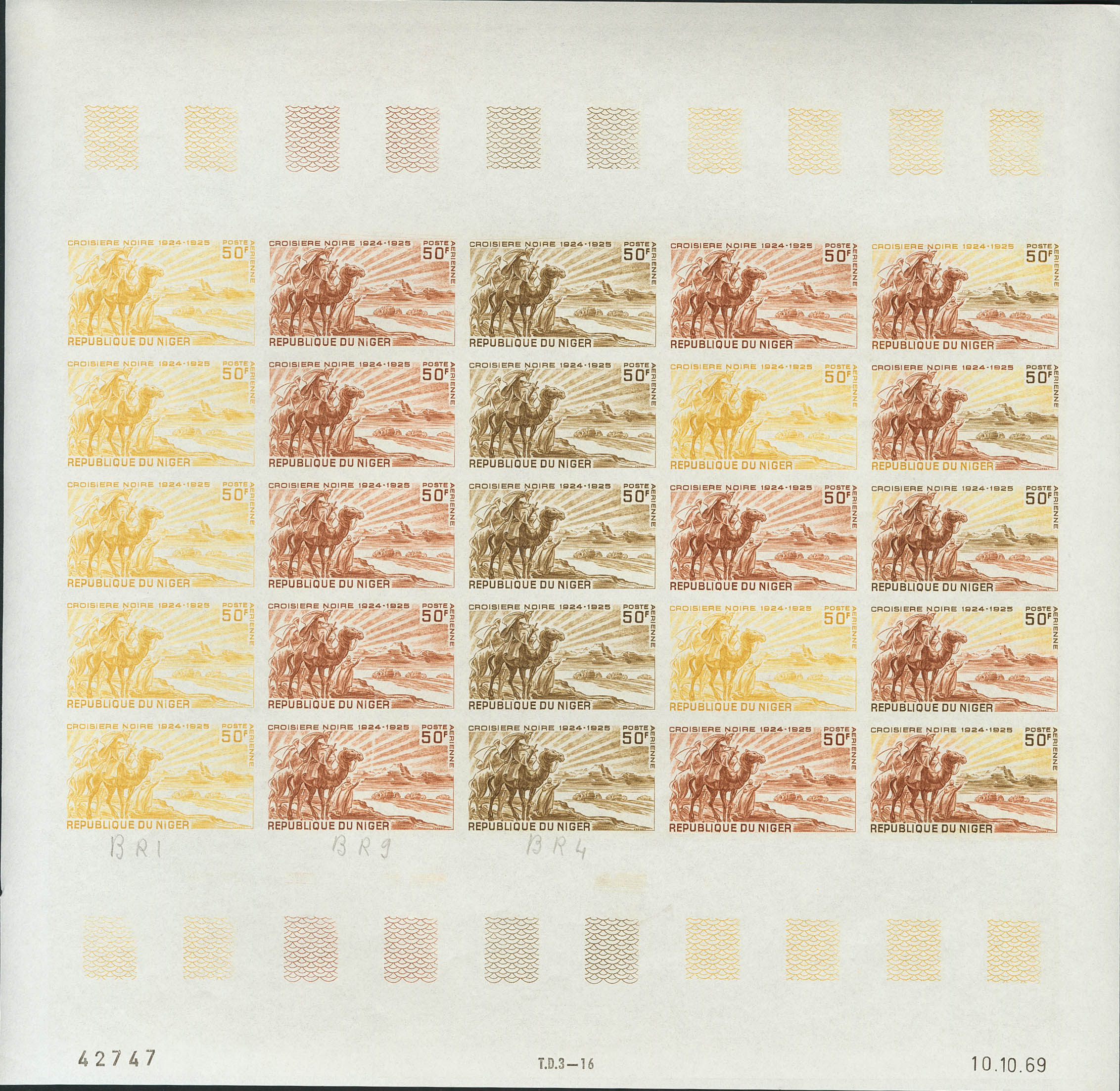 ★★Yvert 115(25). 1969. 50 f multicolor, hoja completa de veinticinco sellos. ENSAYOS DE COLOR y SIN DENTAR, en diferentes colores e incluyendo los multicolores de la última fila. MAGNIFICA Y RARA.