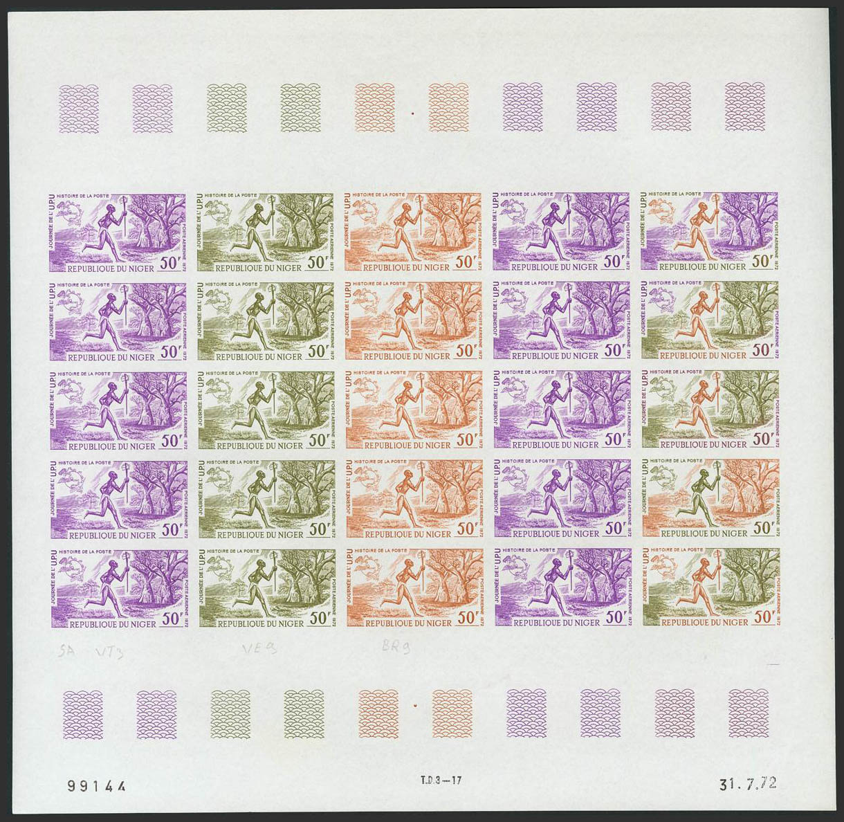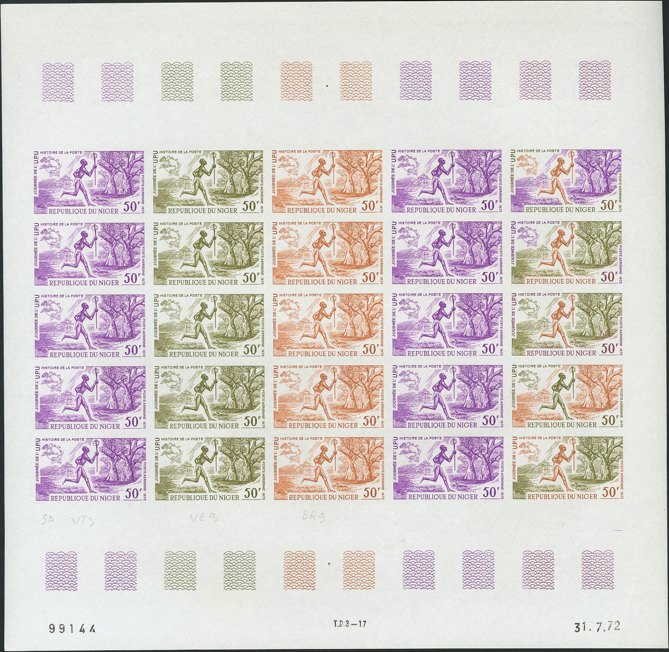 ★★Yvert 194(25). 1972. 50 f multicolor, hoja completa de veinticinco sellos. ENSAYOS DE COLOR y SIN DENTAR, en diferentes colores e incluyendo los multicolores de la última fila. MAGNIFICA Y RARA.