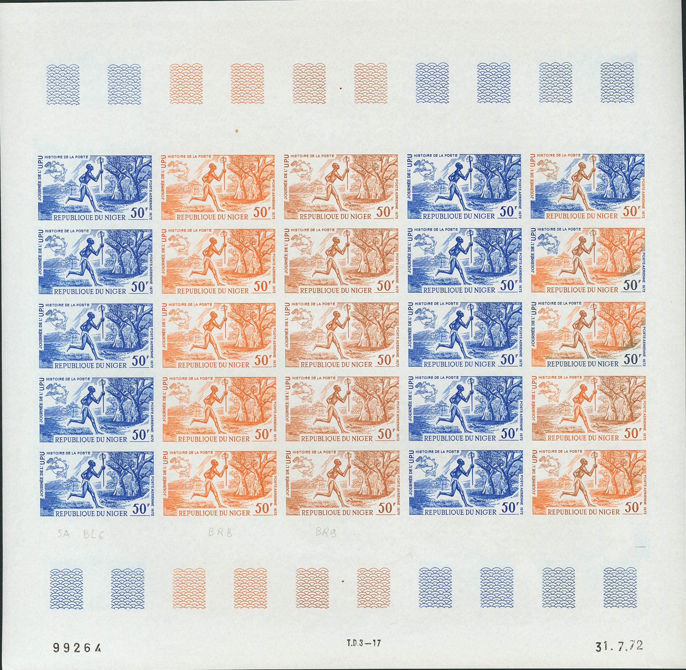 ★★Yvert 194(25). 1972. 50 f multicolor, hoja completa de veinticinco sellos. ENSAYOS DE COLOR y SIN DENTAR, en diferentes colores e incluyendo los multicolores de la última fila. MAGNIFICA Y RARA.