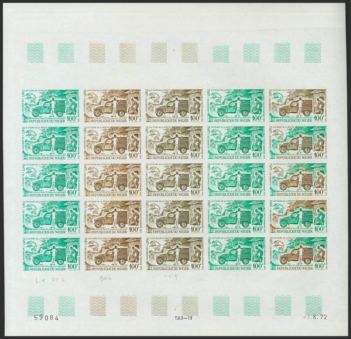★★Yvert 194(25). 1972. 100 f multicolor, hoja completa de veinticinco sellos. ENSAYOS DE COLOR y SIN DENTAR, en diferentes colores e incluyendo los multicolores de la última fila. MAGNIFICA Y RARA.