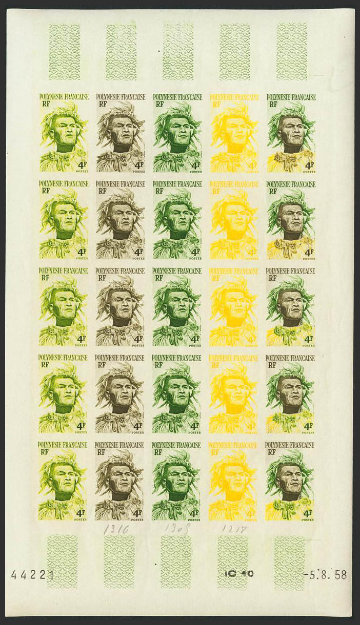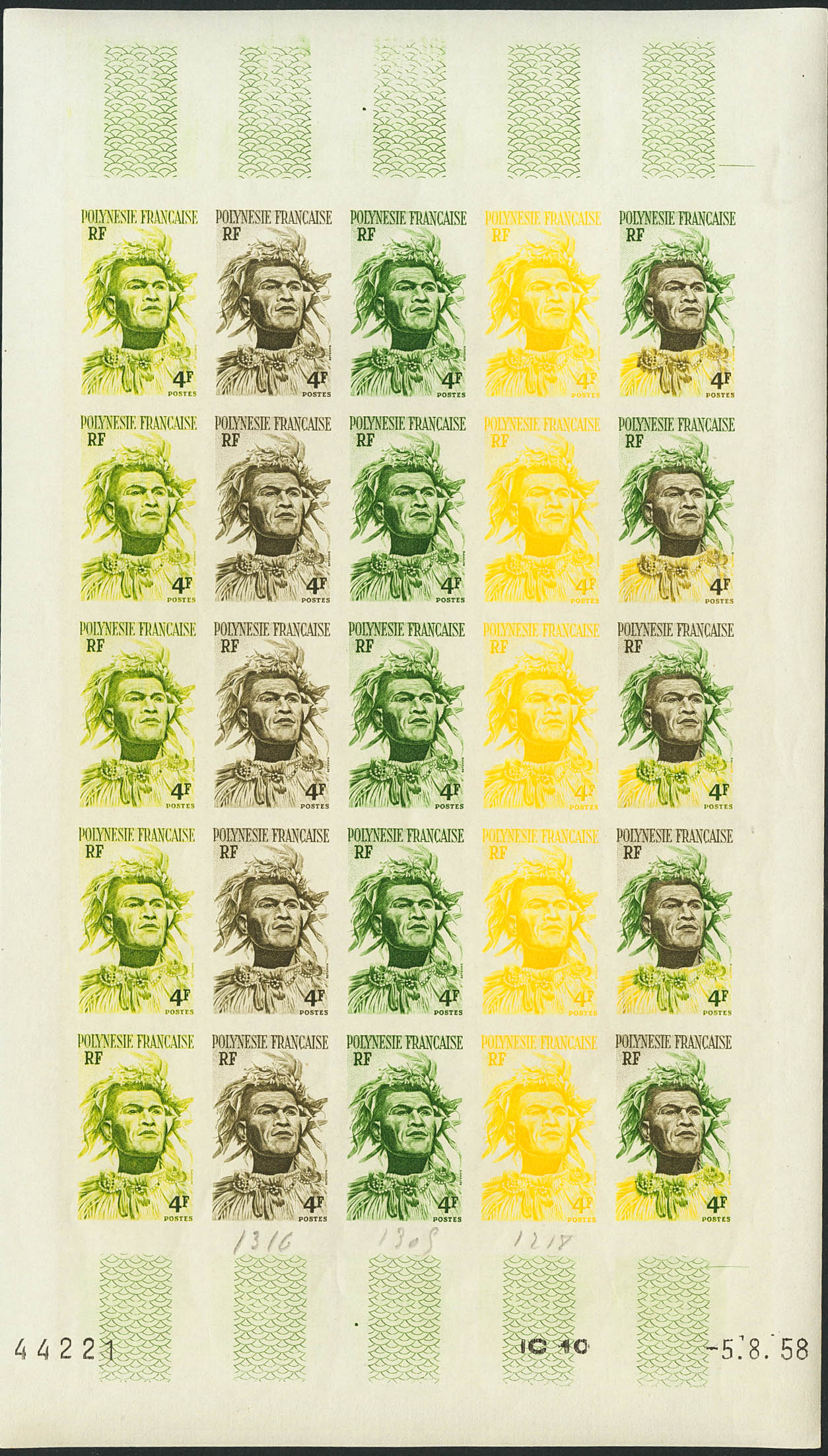 ★★Yvert 5(25). 1958. 4 f multicolor, hoja completa de veinticinco sellos. ENSAYOS DE COLOR y SIN DENTAR, en diferentes colores e incluyendo los multicolores de la última fila. MAGNIFICA Y RARA.