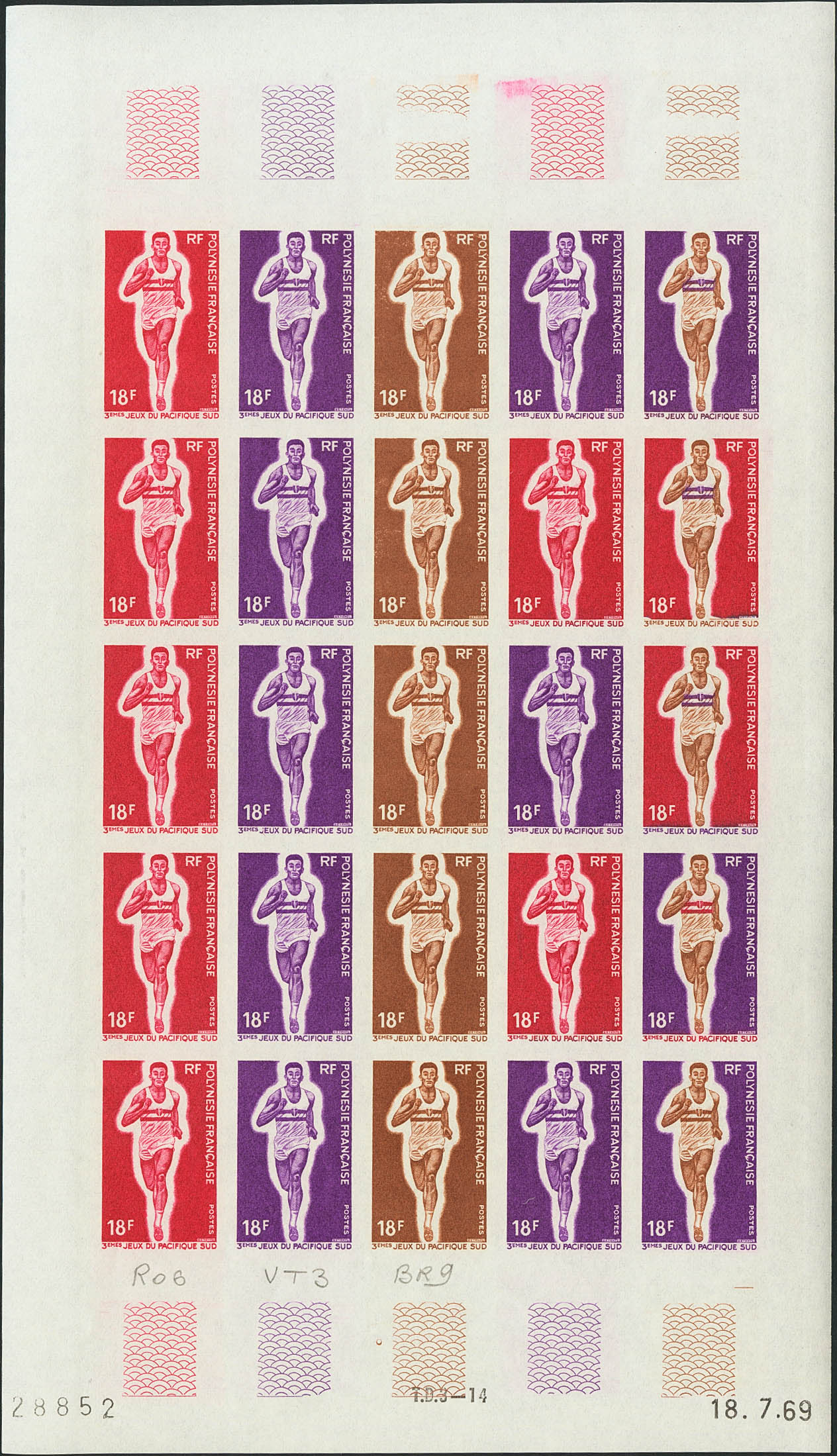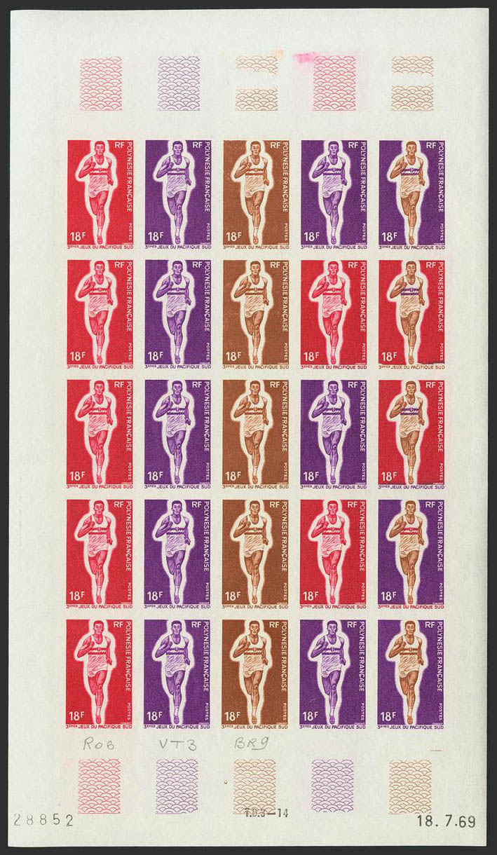★★Yvert 68(25). 1969. 18 f multicolor, hoja completa de veinticinco sellos. ENSAYOS DE COLOR y SIN DENTAR, en diferentes colores e incluyendo los multicolores de la última fila. MAGNIFICA Y RARA.