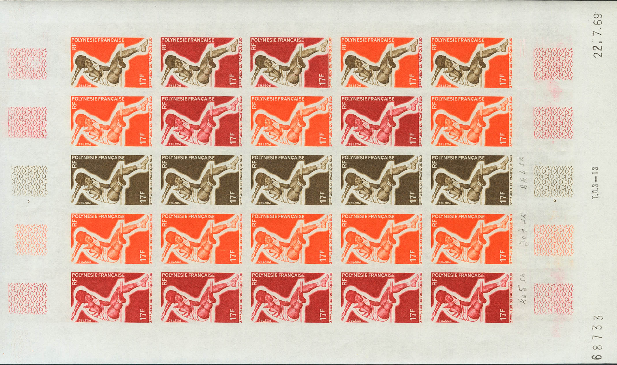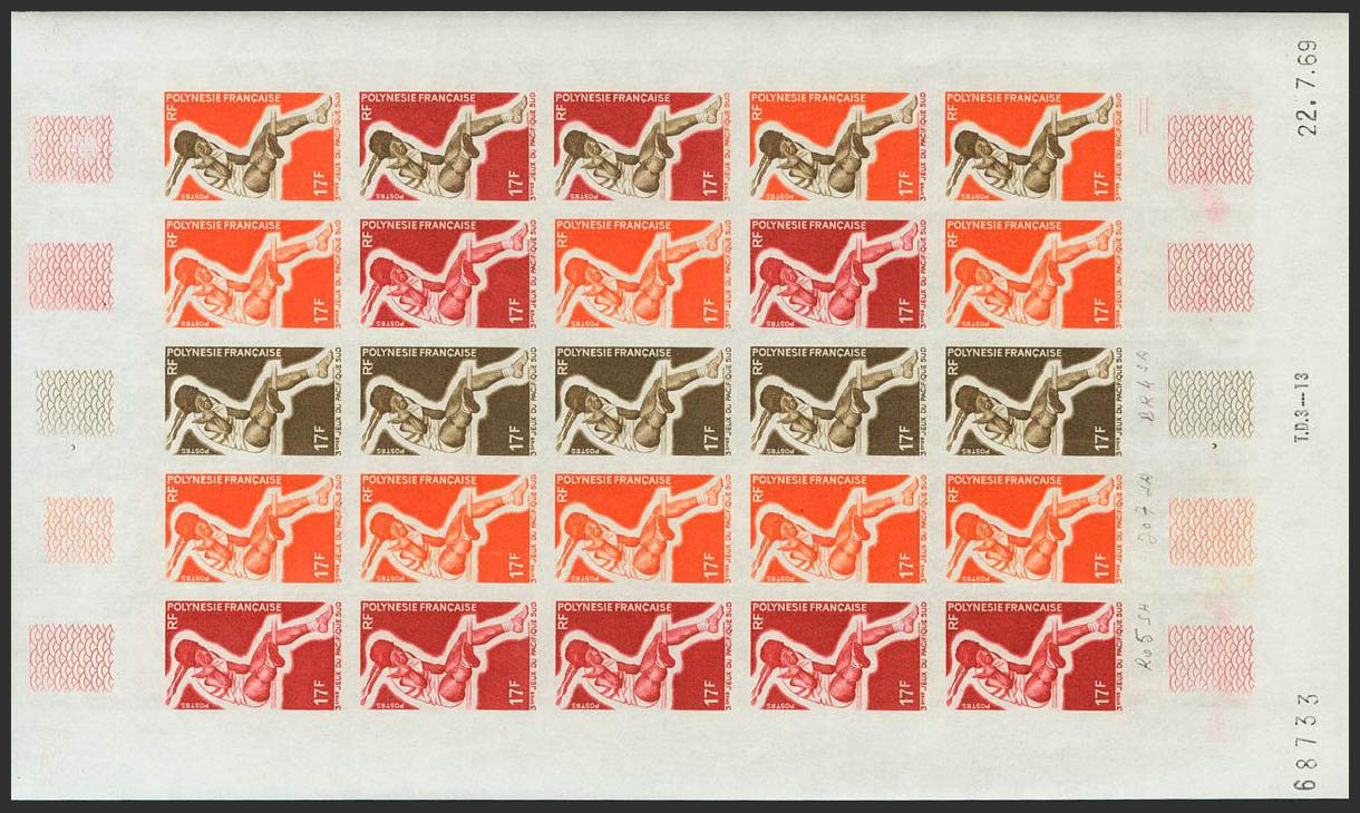 ★★Yvert 67(25). 1969. 17 f multicolor, hoja completa de veinticinco sellos. ENSAYOS DE COLOR y SIN DENTAR, en diferentes colores e incluyendo los multicolores de la última fila. MAGNIFICA Y RARA.