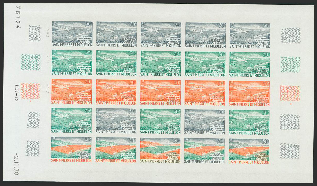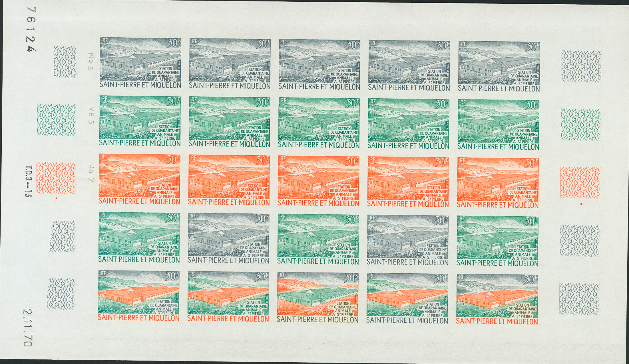 ★★Yvert 408(25). 1970. 30 f multicolor, hoja completa de veinticinco sellos. ENSAYOS DE COLOR y SIN DENTAR, en diferentes colores e incluyendo los multicolores de la última fila. MAGNIFICA Y RARA.