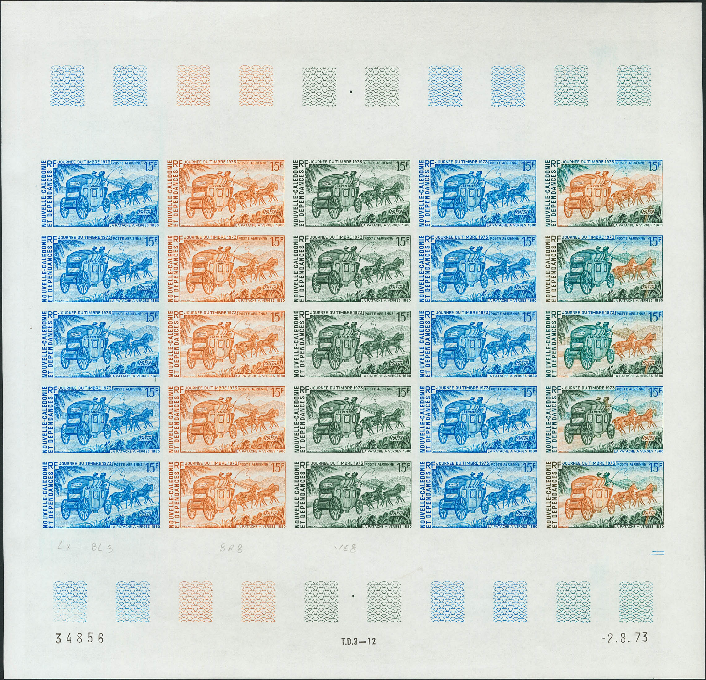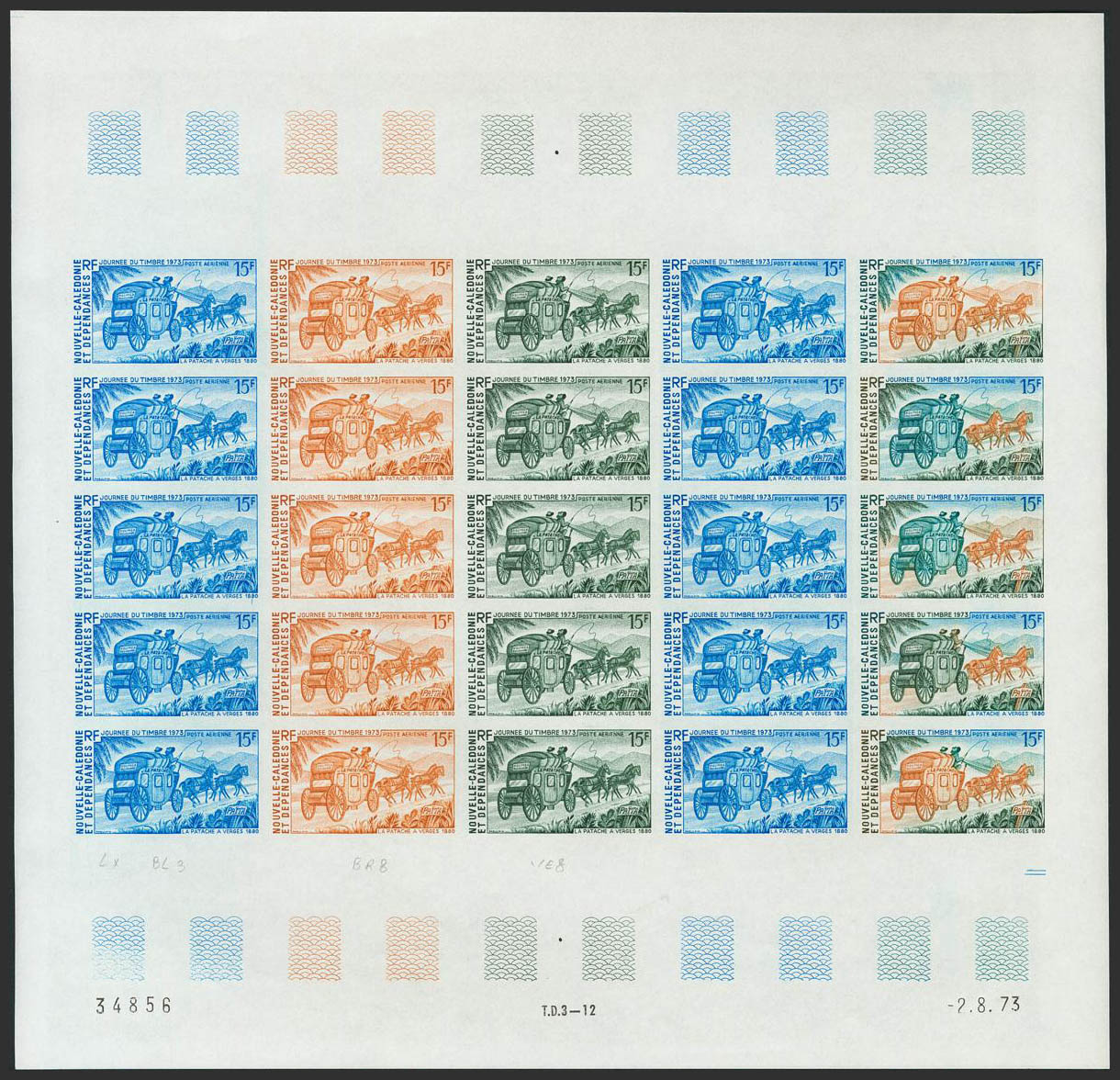 ★★Yvert 146(25). 1973. 15 f multicolor, hoja completa de veinticinco sellos. ENSAYOS DE COLOR y SIN DENTAR, en diferentes colores e incluyendo los multicolores de la última fila. MAGNIFICA Y RARA.