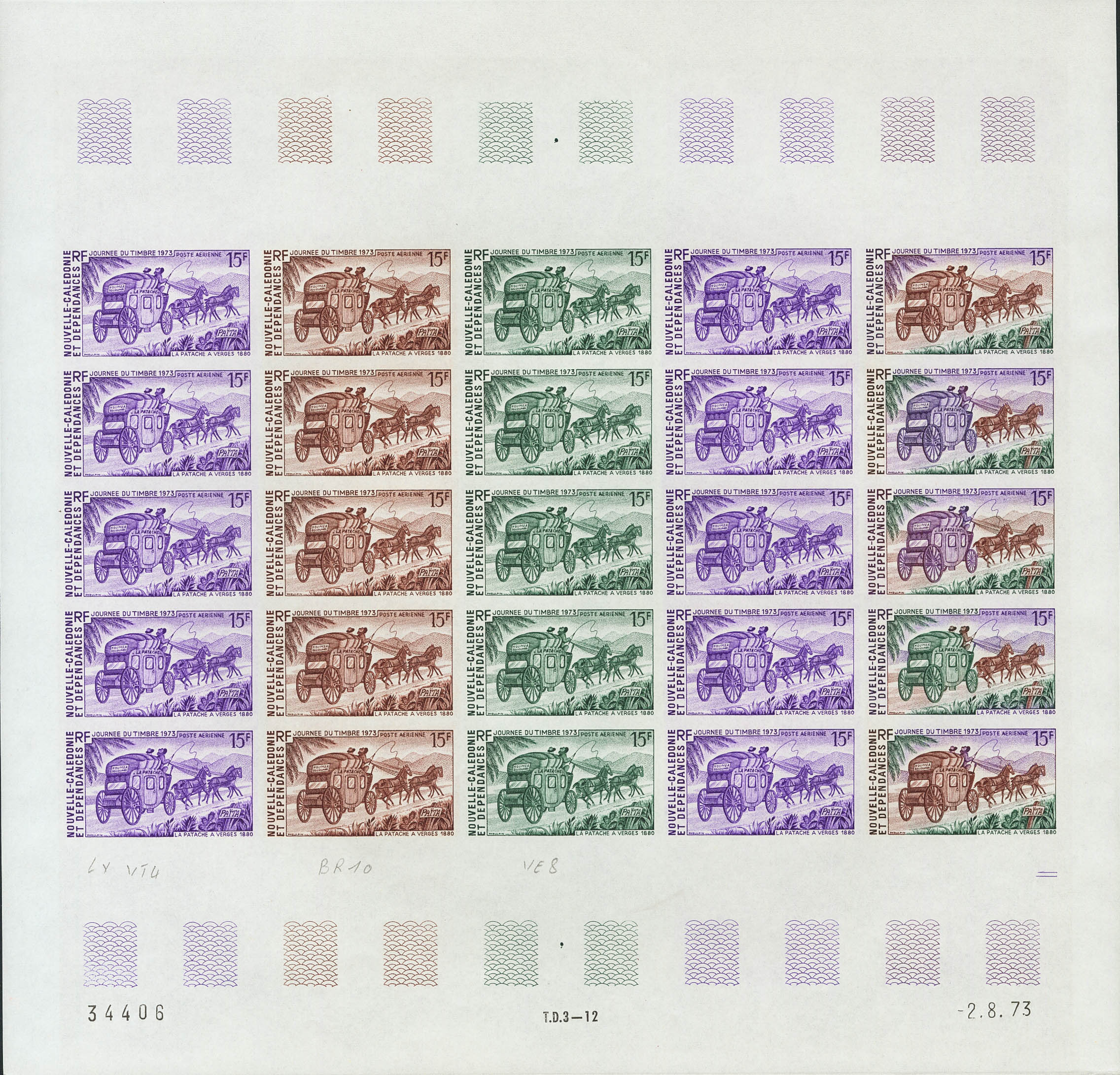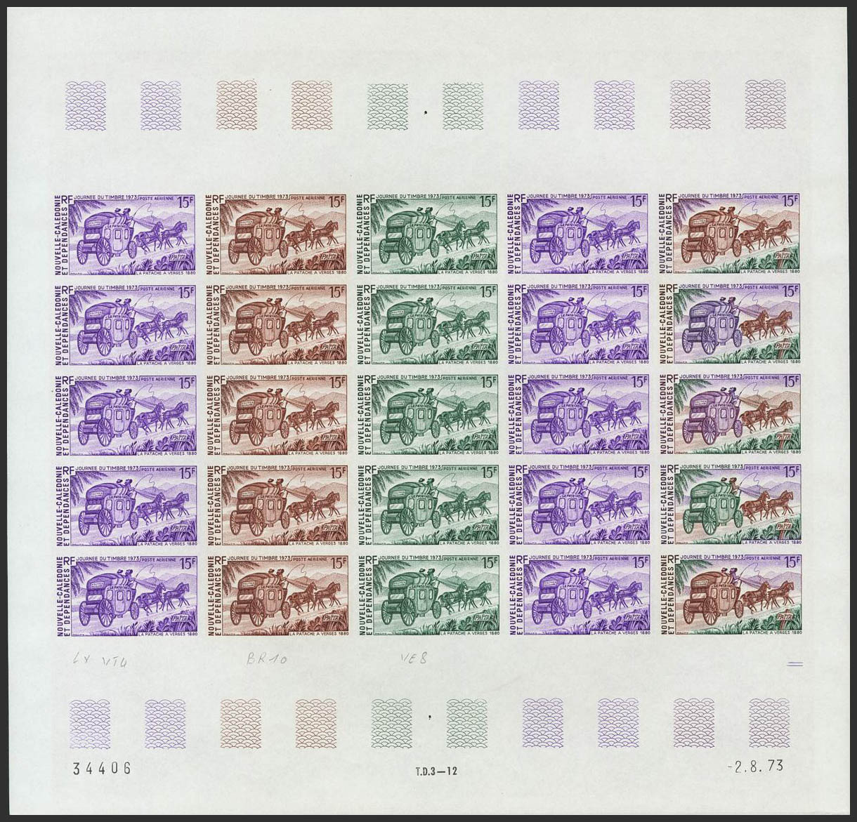 ★★Yvert 146(25). 1973. 15 f multicolor, hoja completa de veinticinco sellos. ENSAYOS DE COLOR y SIN DENTAR, en diferentes colores e incluyendo los multicolores de la última fila. MAGNIFICA Y RARA.