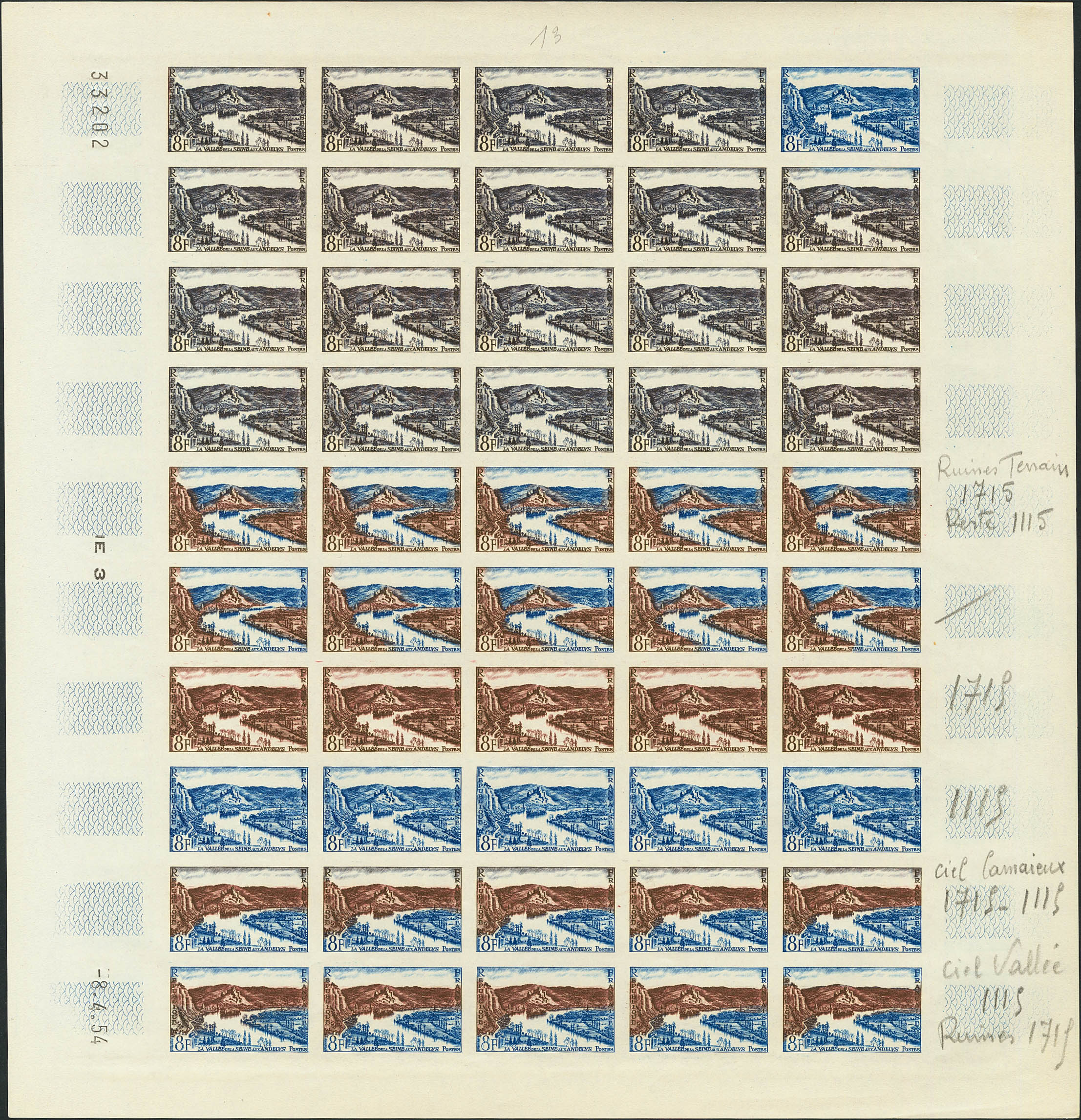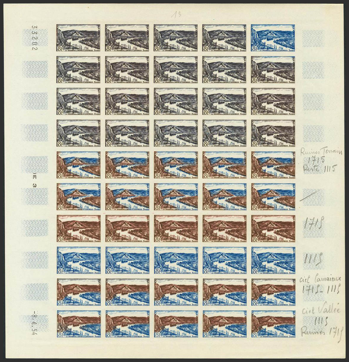 ★★Yvert 977(50). 1954. 8 f multicolor, hoja completa de cincuenta sellos. ENSAYOS DE COLOR y SIN DENTAR, en diferentes colores e incluyendo los multicolores de la última fila. MAGNIFICA Y RARA. (Maury 977 1.500 Euros)