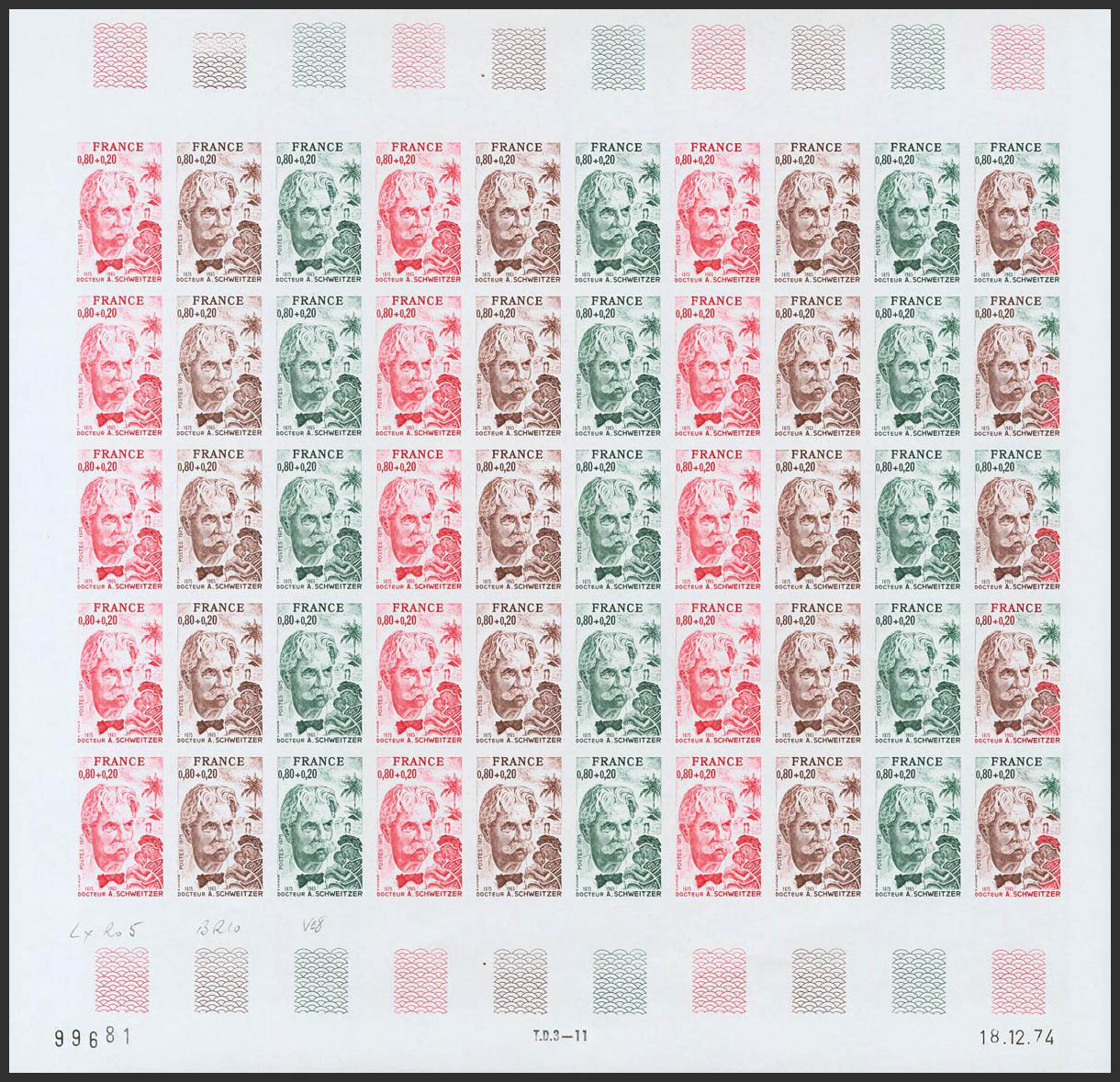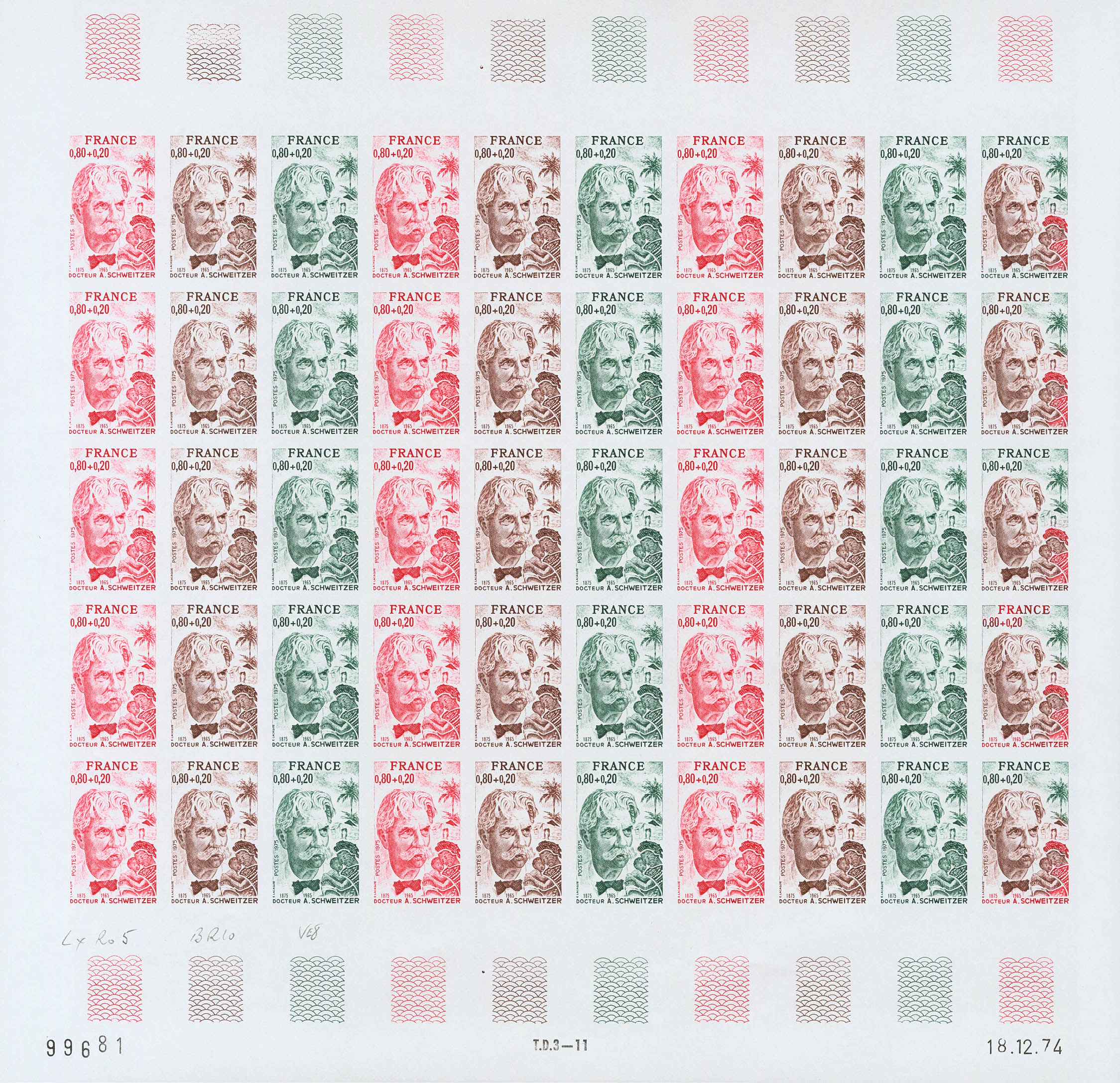 ★★Yvert 1824(50). 1975. 80 cts + 20 cts multicolor, hoja completa de cincuenta sellos. ENSAYOS DE COLOR y SIN DENTAR, en diferentes colores e incluyendo los multicolores de la última fila. MAGNIFICA Y RARA. (Maury 1820 950 Euros)