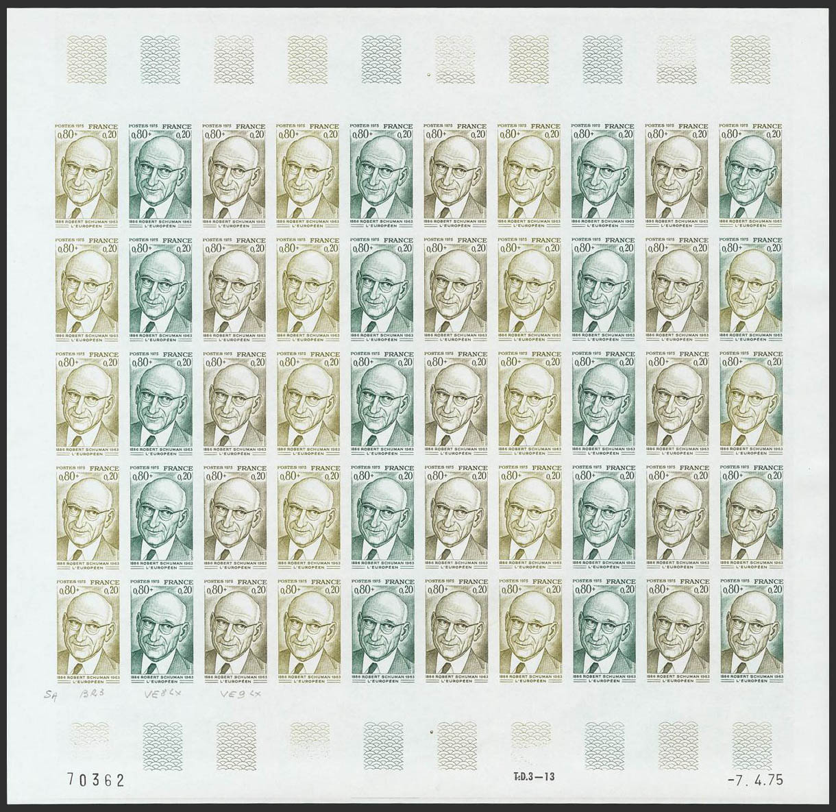 ★★Yvert 1826(50). 1975. 80 cts + 20 cts multicolor, hoja completa de cincuenta sellos. ENSAYOS DE COLOR y SIN DENTAR, en diferentes colores e incluyendo los multicolores de la última fila. MAGNIFICA Y RARA. (Maury 1828 950 Euros)