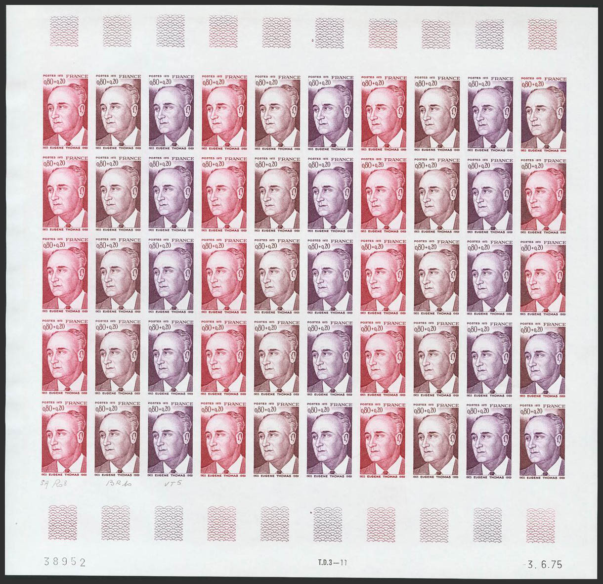 ★★Yvert 1827(50). 1974. 80 cts + 20 cts multicolor, hoja completa de cincuenta sellos. ENSAYOS DE COLOR y SIN DENTAR, en diferentes colores e incluyendo los multicolores de la última fila. MAGNIFICA Y RARA. (Maury 1829 +950 Euros)