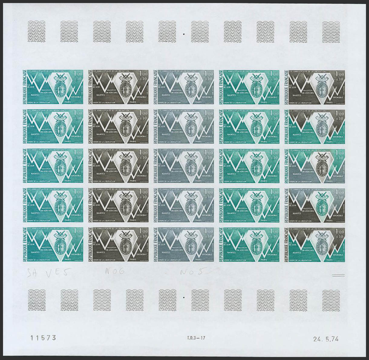★★Yvert 1797(25). 1974. 1 f + 10 cts multicolor, hoja completa de veinticinco sellos. ENSAYOS DE COLOR y SIN DENTAR, en diferentes colores e incluyendo los multicolores de la última fila. MAGNIFICA Y RARA. (Maury 1799 1.000 Euros)