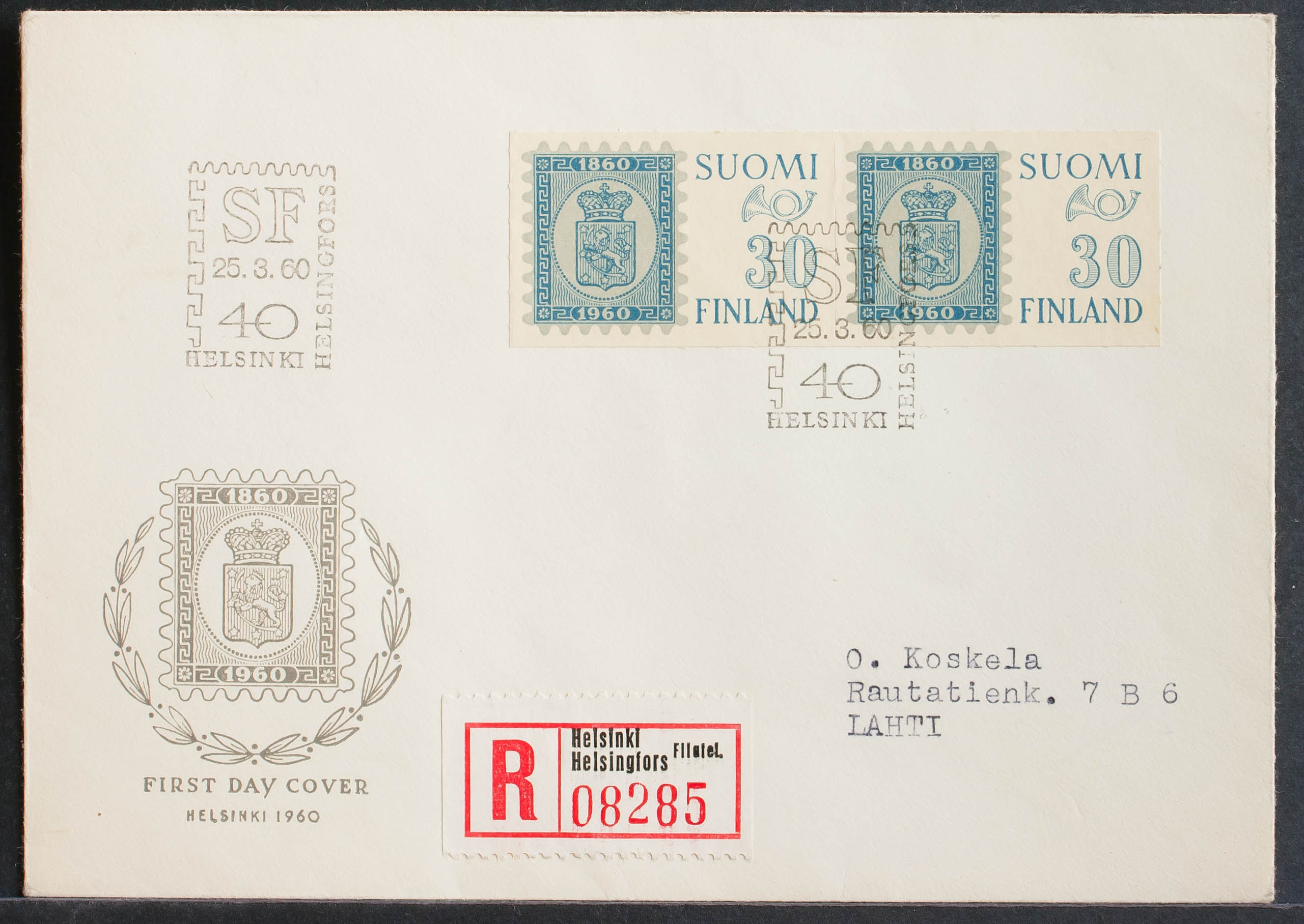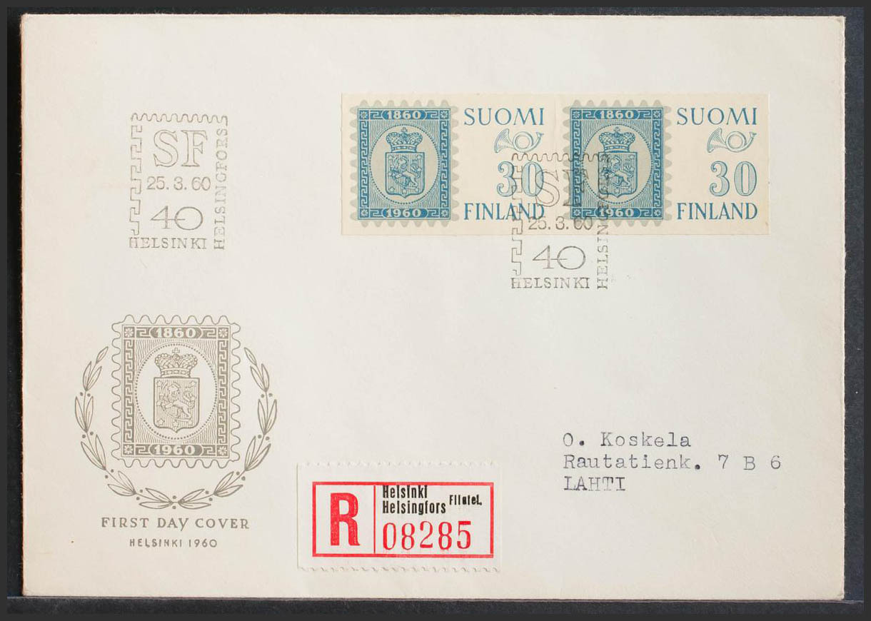 Yvert 492(2). 1960. 30 m azul, pareja. Certificado de HELSINKI a LAHTI. Matasello de Primer DÃa, al dorso llegada. MAGNIFICA.