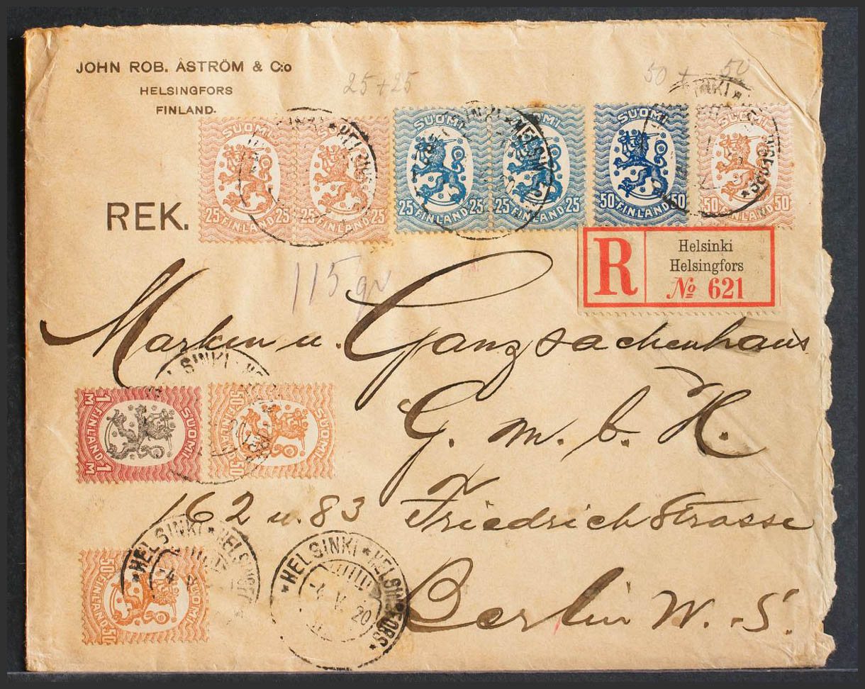 Yvert 72(2), 73(2), 75(3), 76, 77. 1920. Diversos valores. Certificado de HELSINKI a BERLIN (ALEMANIA). BONITA.