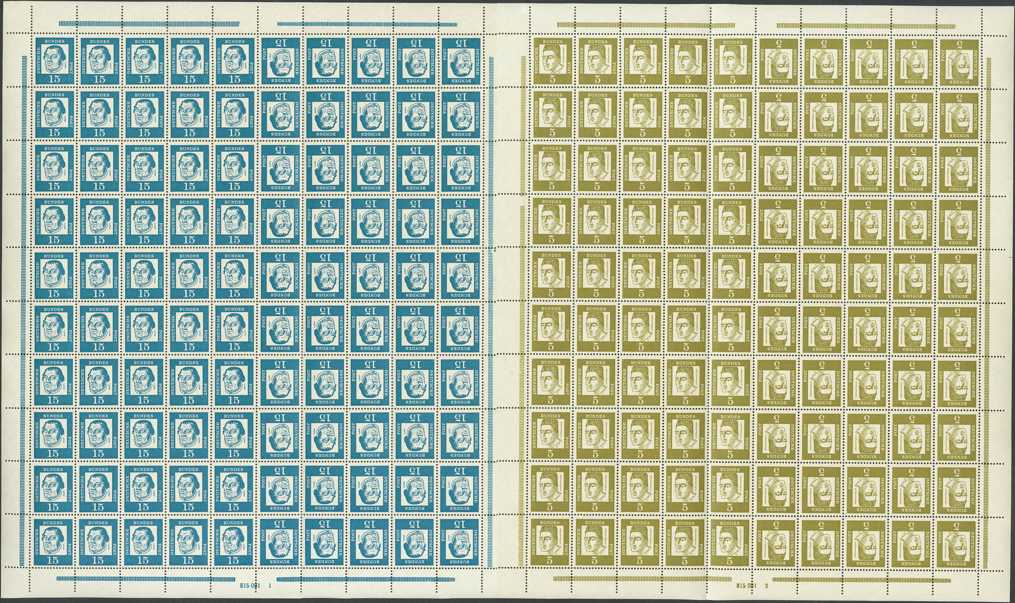 ★★1961. 5 p verde oliva y 15 p azul, pliego completo (margen izquierdo plegado para facilitar su conservación en el guardapliegos) con las diferentes combinaciones de hojitas o bloques para carnet. MAGNIFICO. (Mi MHB7 100 Euros)