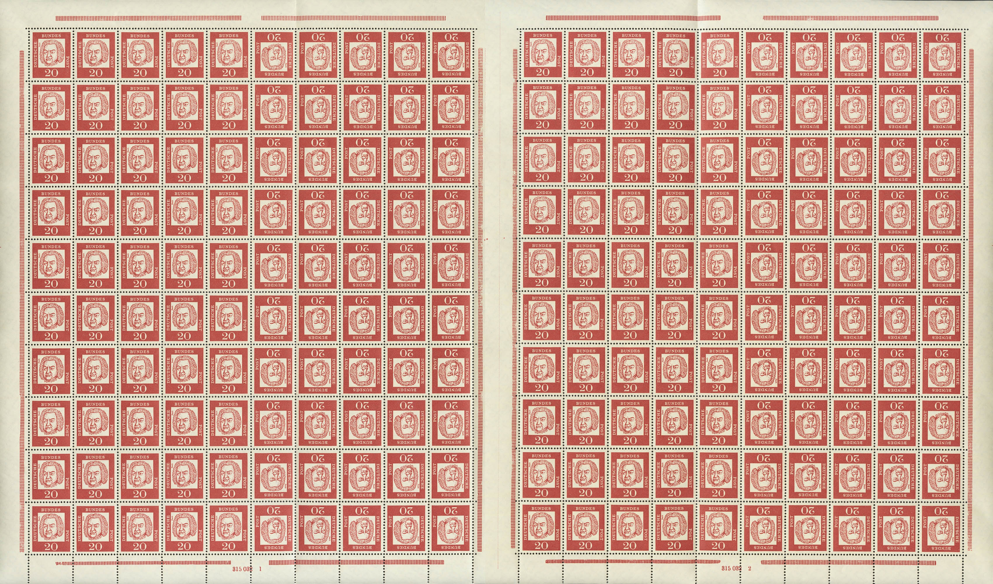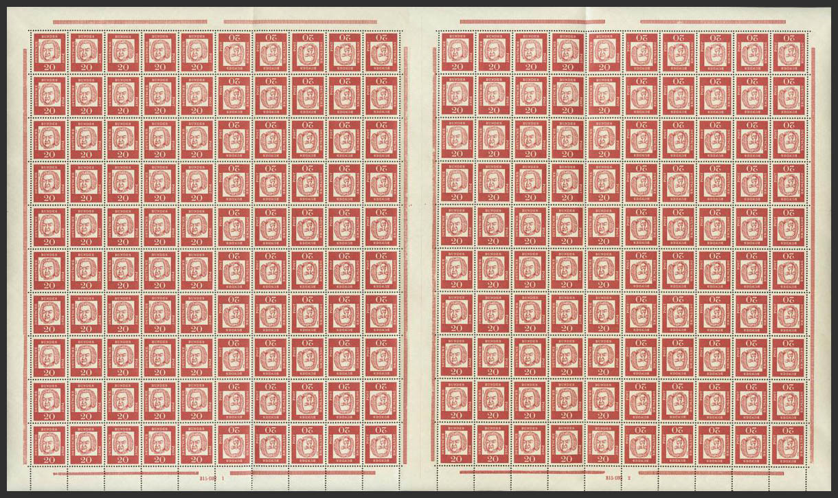 ★★1961. 20 p carmín, pliego completo (margen izquierdo plegado para facilitar su conservación en el guardapliegos) de doscientos sellos con interpanel central y las variedades TETE BECHE. MAGNIFICO. (Mi MHB8 120 Euros)