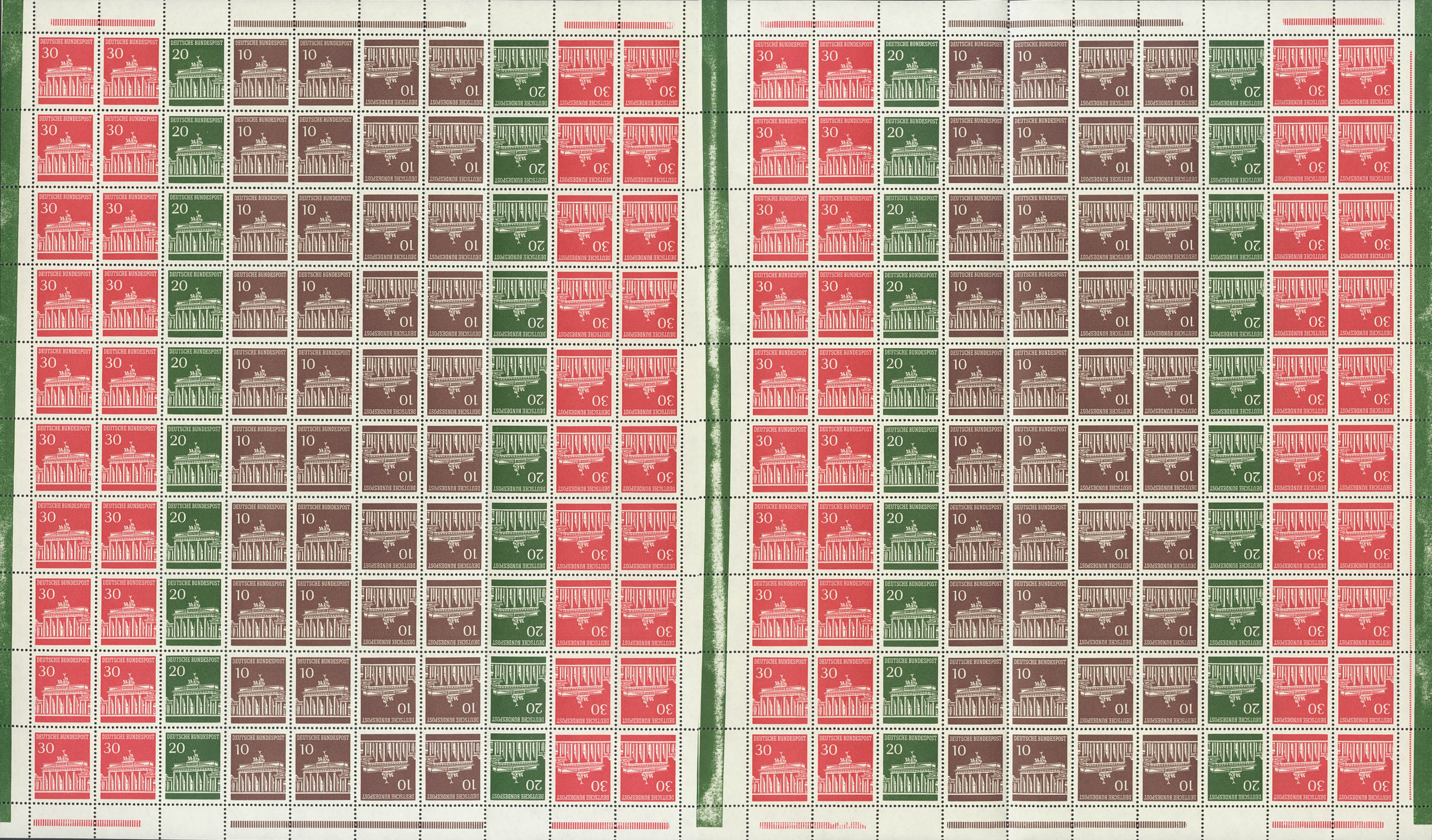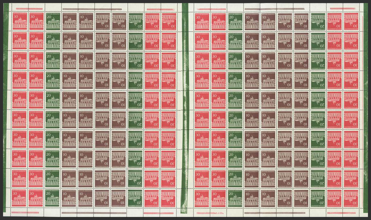 ★★1966. 10 p castaño, 20 p verde y 30 p rojo carmín, pliego completo de doscientos sellos (plegado el margen izquierdo para su conservación en el guardapliegos) con interpanel central y las diversas combinaciones, algunas TETE BECHE. MAGNIFICO. (Mi MHB12 120 Euros)