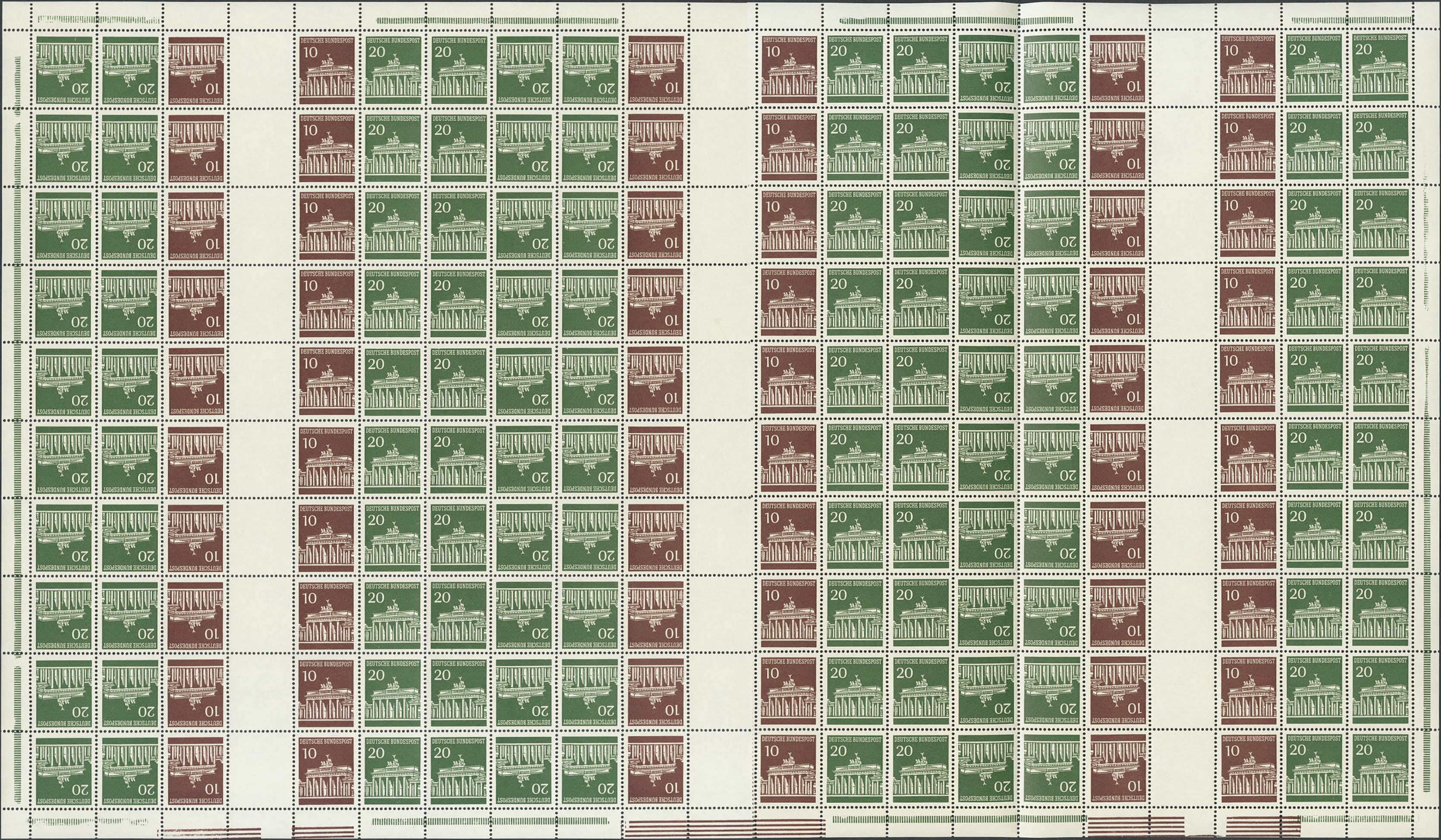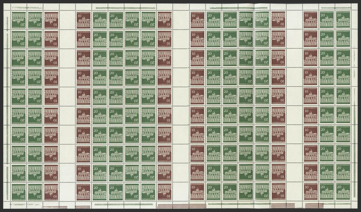 ★★1966. 10 p castaño y 20 p verde, pliego completo (plegado el margen izquierdo para su conservación en el guardapliegos) con las diversas combinaciones de hojitas o bloques para carnets con interpanel y TETE BECHE. MAGNIFICO. (Mi MHB13 110 Euros)
