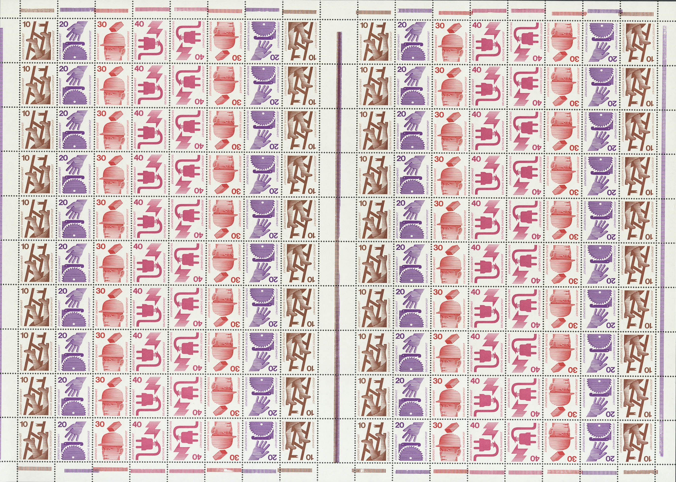★★Yvert 564, 565, 574, 575. 1972. 10 p castaño, 20 p violeta, 30 p carmÃn y 40 p lila, pliego completo (plegado en el centro para su conservación en el guardapliegos) con las diversas combinaciones de hojitas o bloques para carnets con interpanel y TETE BECHE. MAGNIFICO. (Mi MHB180 Euros)