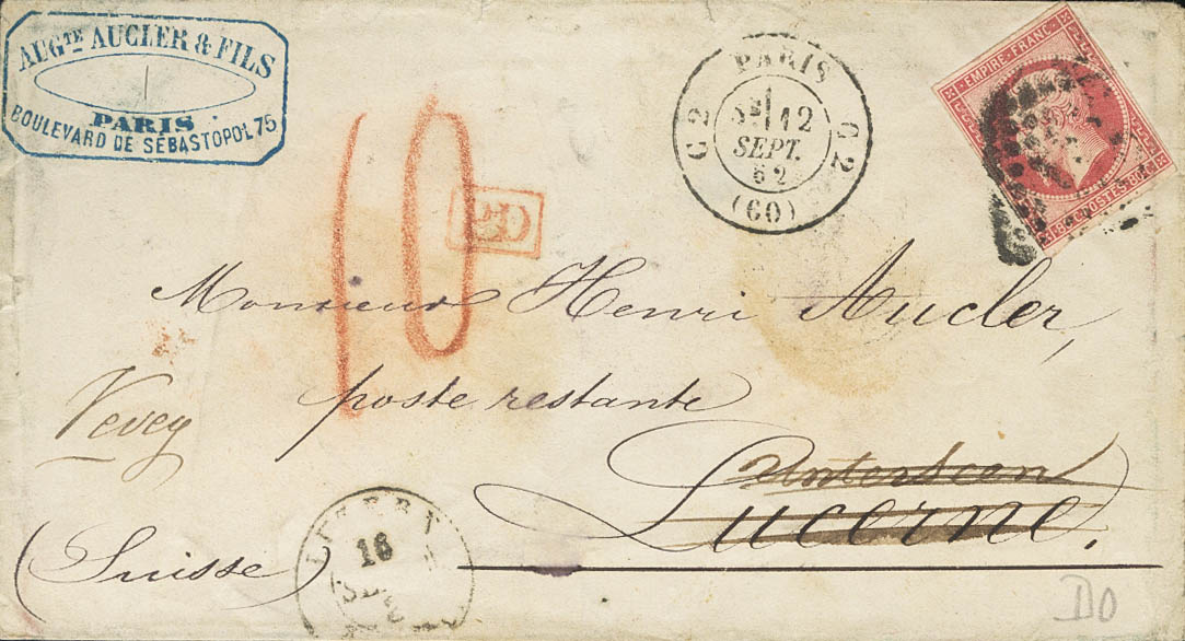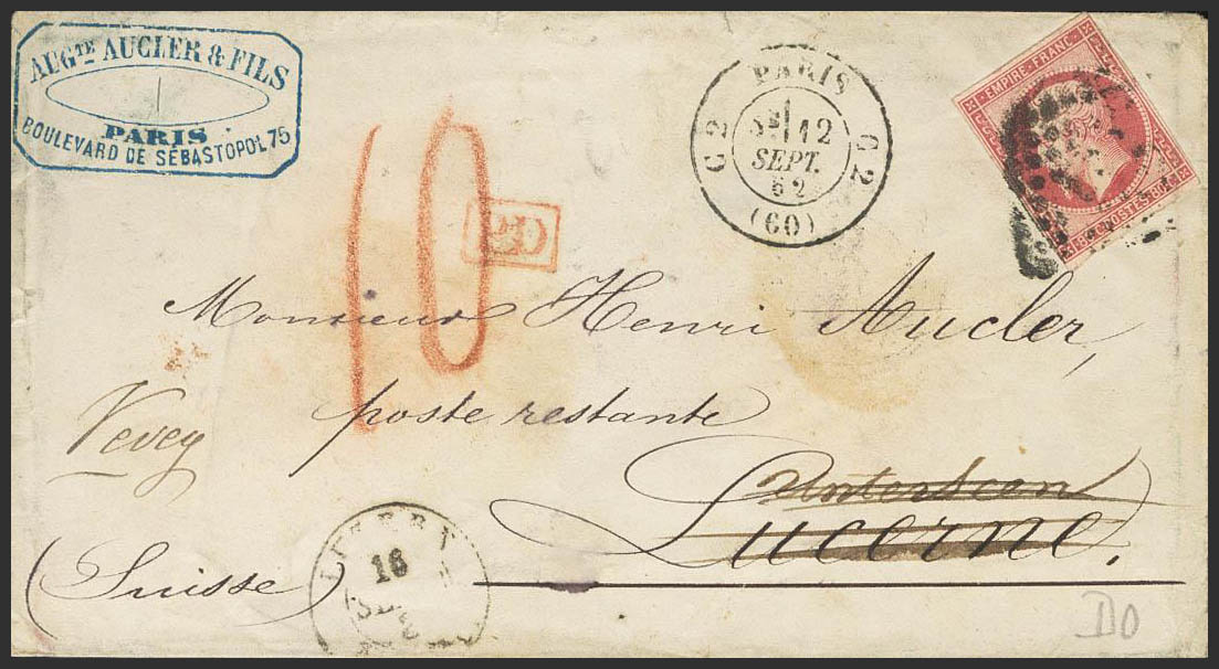Yvert 17B. 1862. 80 cts rosa "PERCE EN LIGNES". PARIS a LUCERNA (SUIZA), reexpedida a VEVEY. En el frente tasa manuscrita suiza "10", en rojo. MAGNIFICA. Yvert 2014: 300 Euros