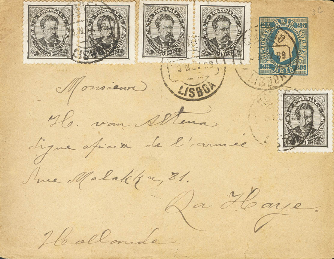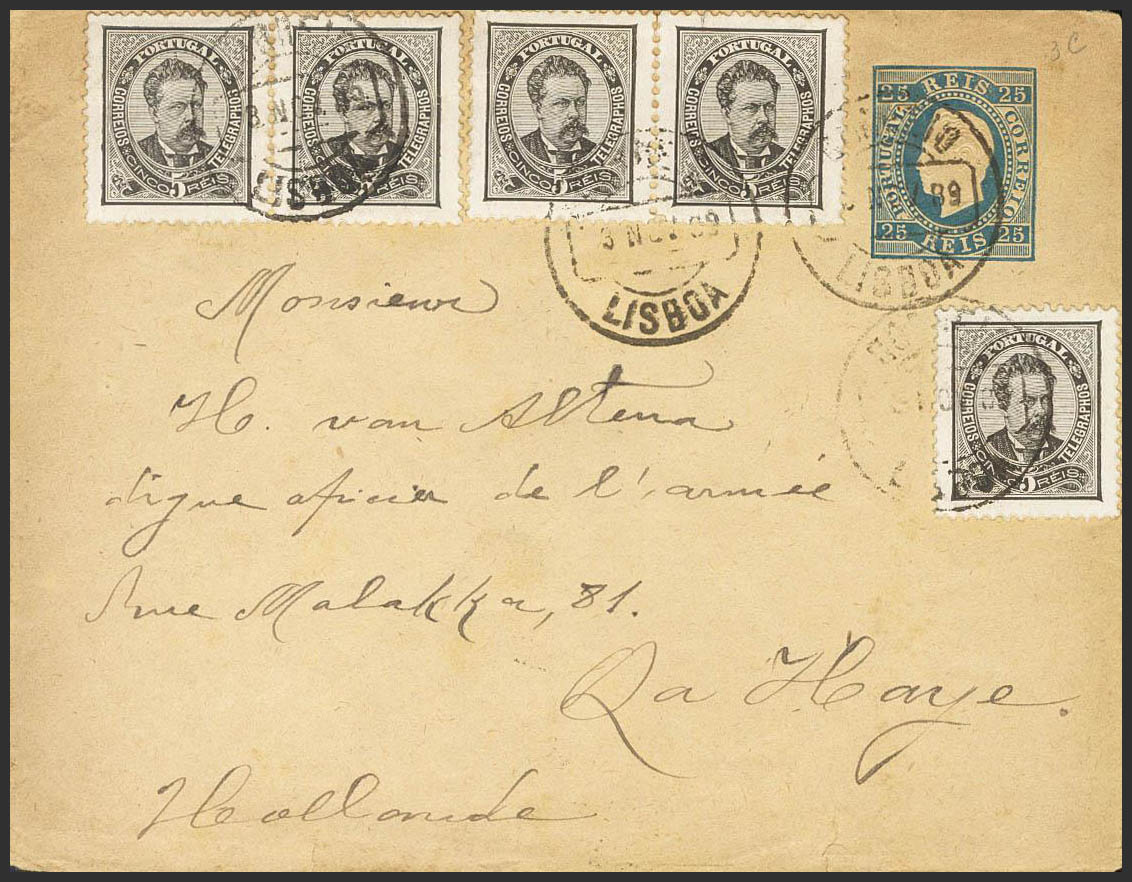 Yvert 56(5). 1889. 25 reis azul sobre Entero Postal de LISBOA a LA HAYA (HOLANDA), con franqueo complementario de 5 reis negro, cinco sellos. Al dorso llegada. MAGNIFICA Y ESPECTACULAR Y MUY RARO FRANQUEO.