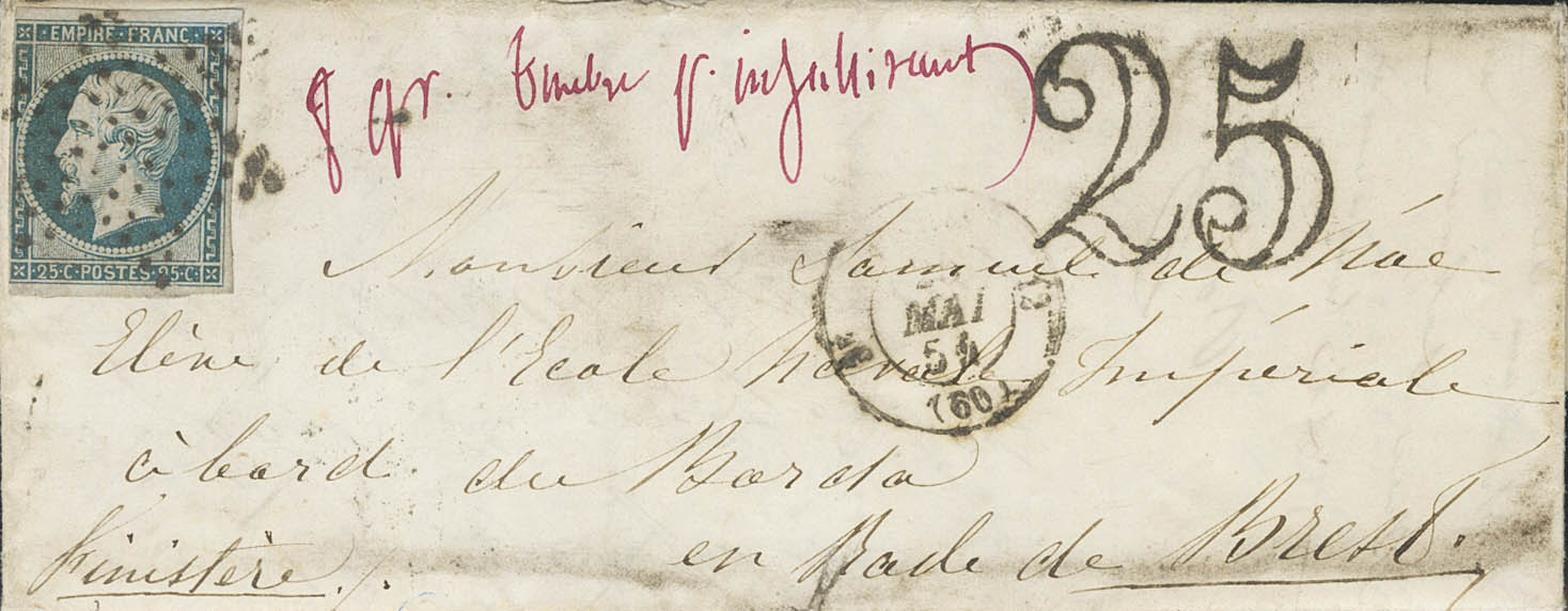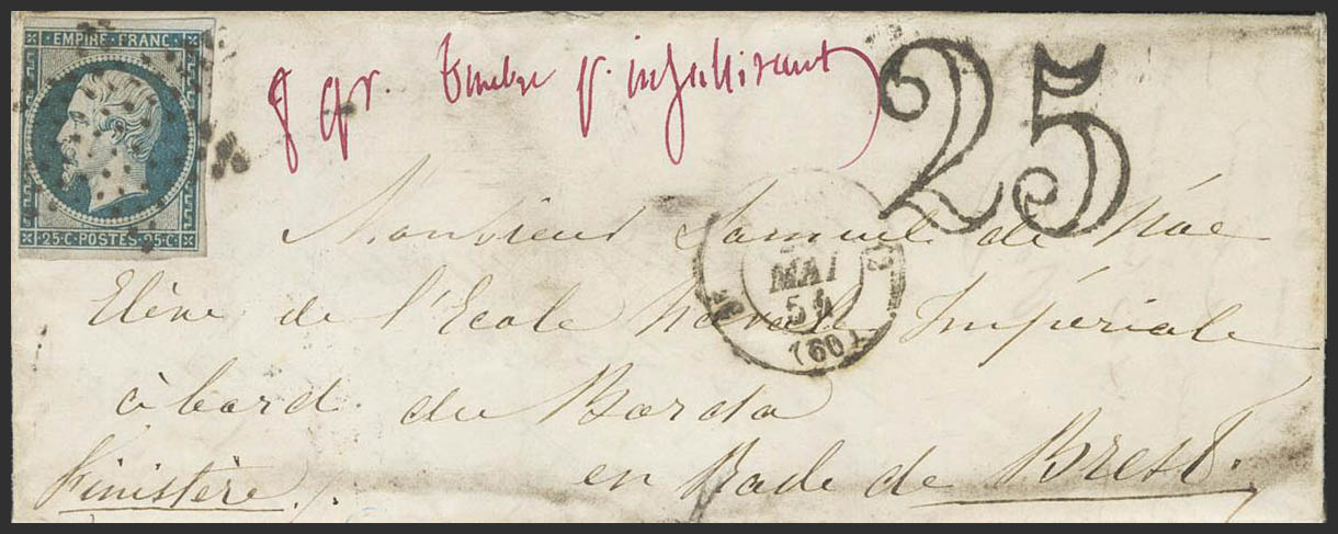 Yvert 15a. 1854. 25 cts azul lechoso (margen izquierdo justo). PARIS a BREST. Dirigida a un oficial de la Escuela Naval Militar situada en el buque La Borda, donde la Escuela estuvo ubicada entre 1854 y 1890. BONITA Y RARA CON FRANQUEO INSUFICIENTE.