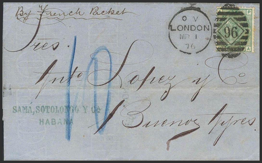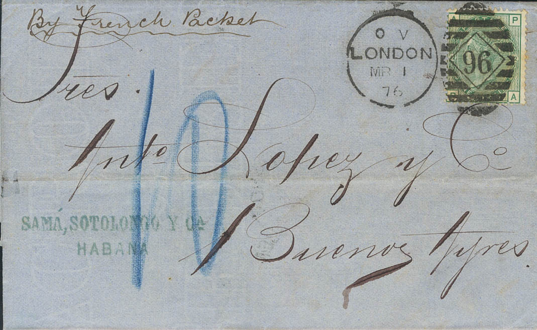 Yvert 53. 1875. 1 s verde Plancha 12. LA HABANA a BUENOS AIRES, encaminada privadamente hasta Londres, donde es depositada en el correo hasta su destino final. MAGNIFICA Y MUY RARA.