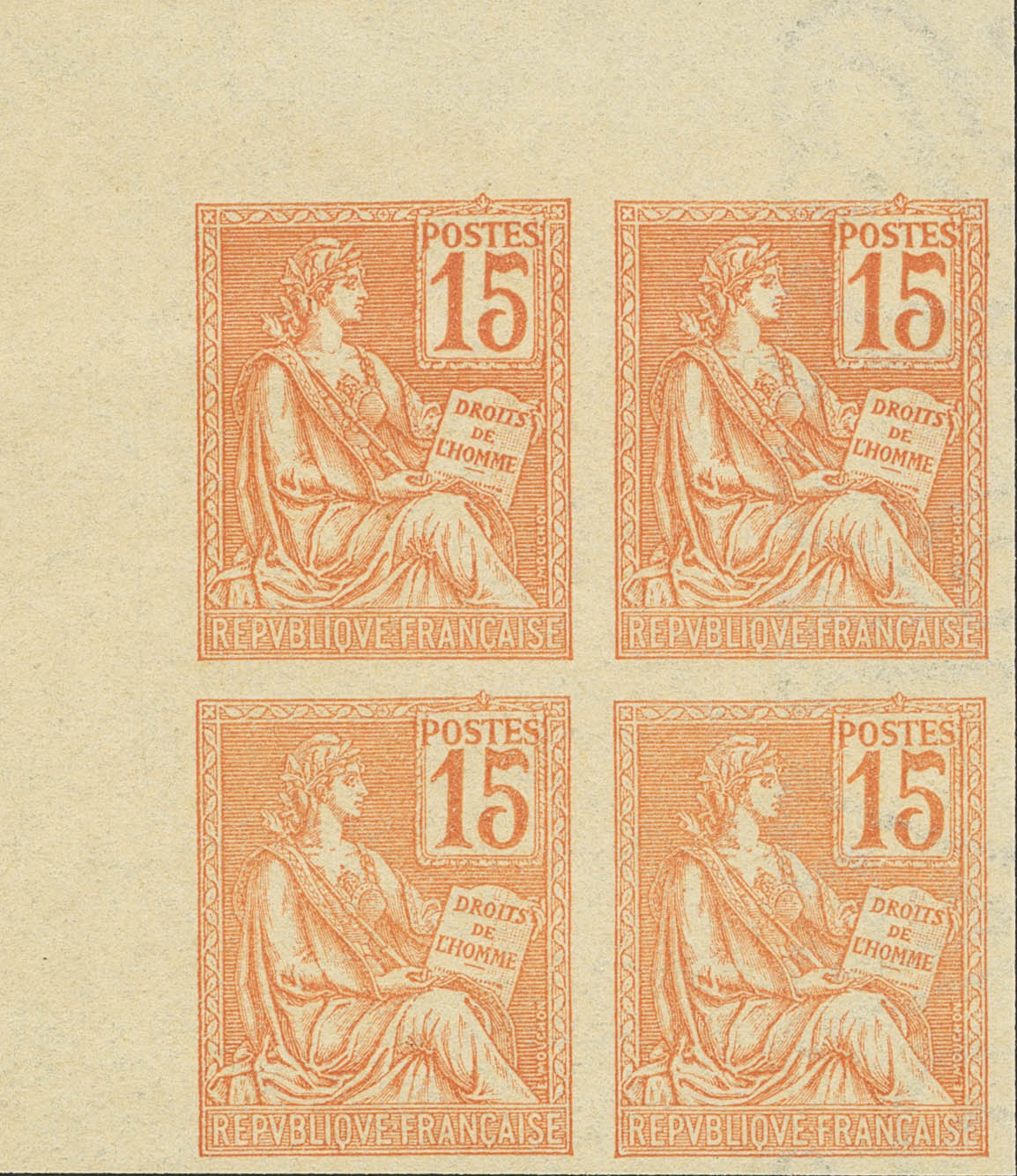 (★)Yvert 125b(4). 1902. 15 cts naranja, bloque de cuatro, esquina de pliego. SIN DENTAR. MAGNIFICO Y RARO. Yvert 2014: 4.000 Euros