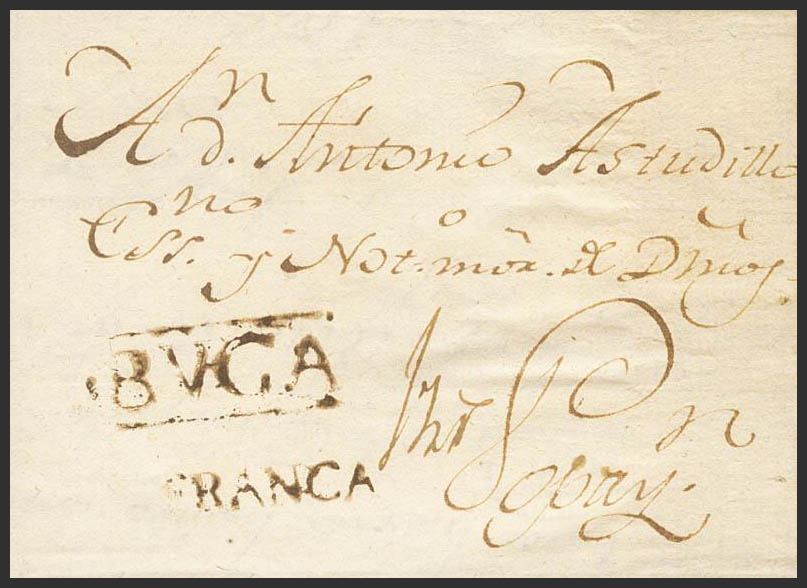 1809. BUGA a POPAYAN. Marca BVGA y FRANCA, en tinta de escribir (P.E.1 y P.E.4) edición 2004. MAGNIFICA ESTAMPACION Y RARISIMA, SIN DUDA LA MEJOR CONOCIDA.