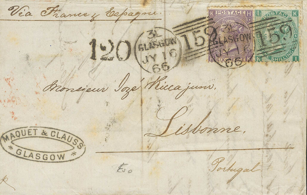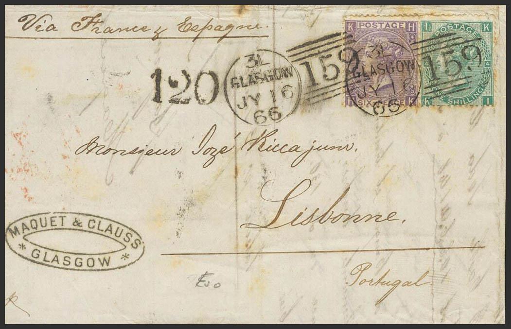 Yvert 29, 31. 1866. 6 p violeta Plancha 5 y 1 s verde Plancha 4. GLASGOW (ESCOCIA) a LISBOA (PORTUGAL). MAGNIFICA. (SG97, 101)