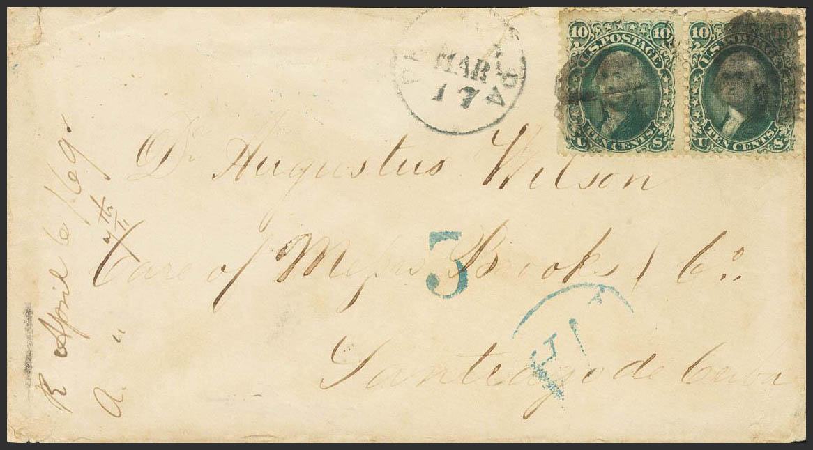Yvert 22(2). 1869. 10 ctvos verde, pareja. Dirigida a SANTIAGO DE CEIBA (CUBA). En el frente marca NA, en azul de la empresa de Correos Marítimos de La Habana aplicada en tránsito para indicar el origen. BONITA Y RARA.
