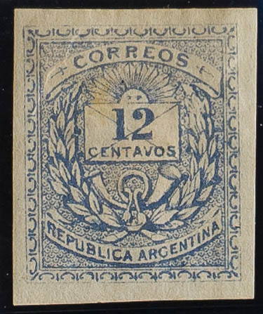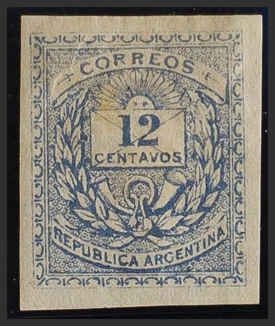 ★Yvert 12. 1882. 12 ctvos ultramar (manchita del tiempo). SIN DENTAR. BONITO Y RARO.