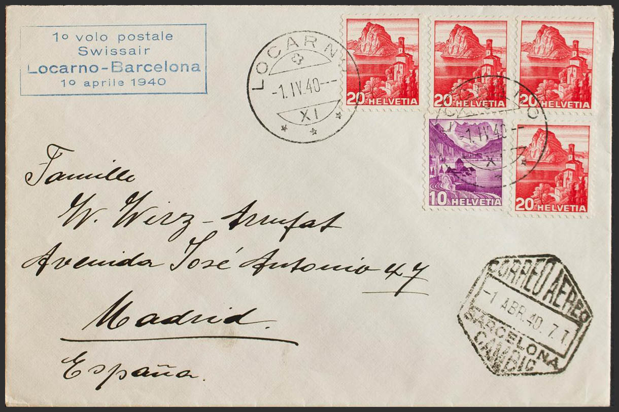 Yvert 312(4), 291. 1936. 20 cts rojo, cuatro sellos y 10 cts lila. LOCARNO a MADRID. En el frente marca 1º VOLO POSTALE / SWISSAIR / LOCARNO-BARCELONA / 1º APRILE 1940, en azul y al dorso llegada. MAGNIFICA.
