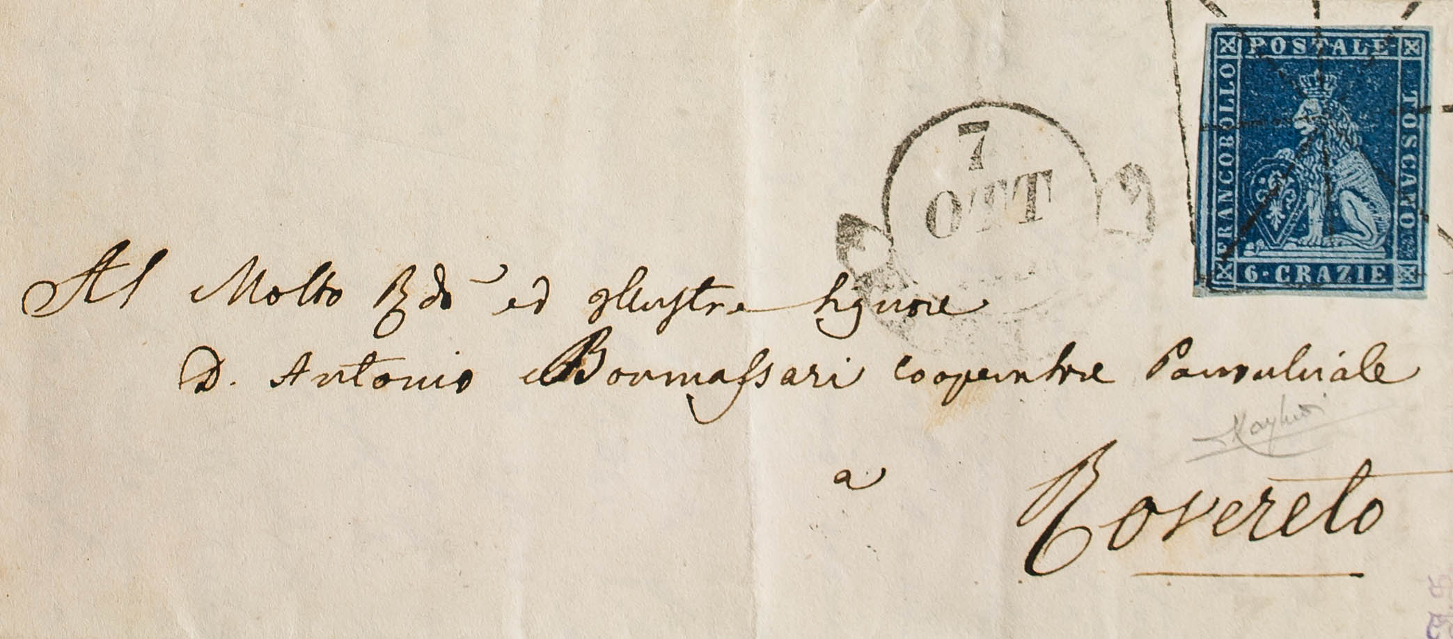 Yvert 7. 1851. 6 crazie azul oscuro sobre azulado. FLORENCIA a ROVERETO. Matasello mudo ARAÑA (rectangular). MAGNIFICA. (Sassone 7)