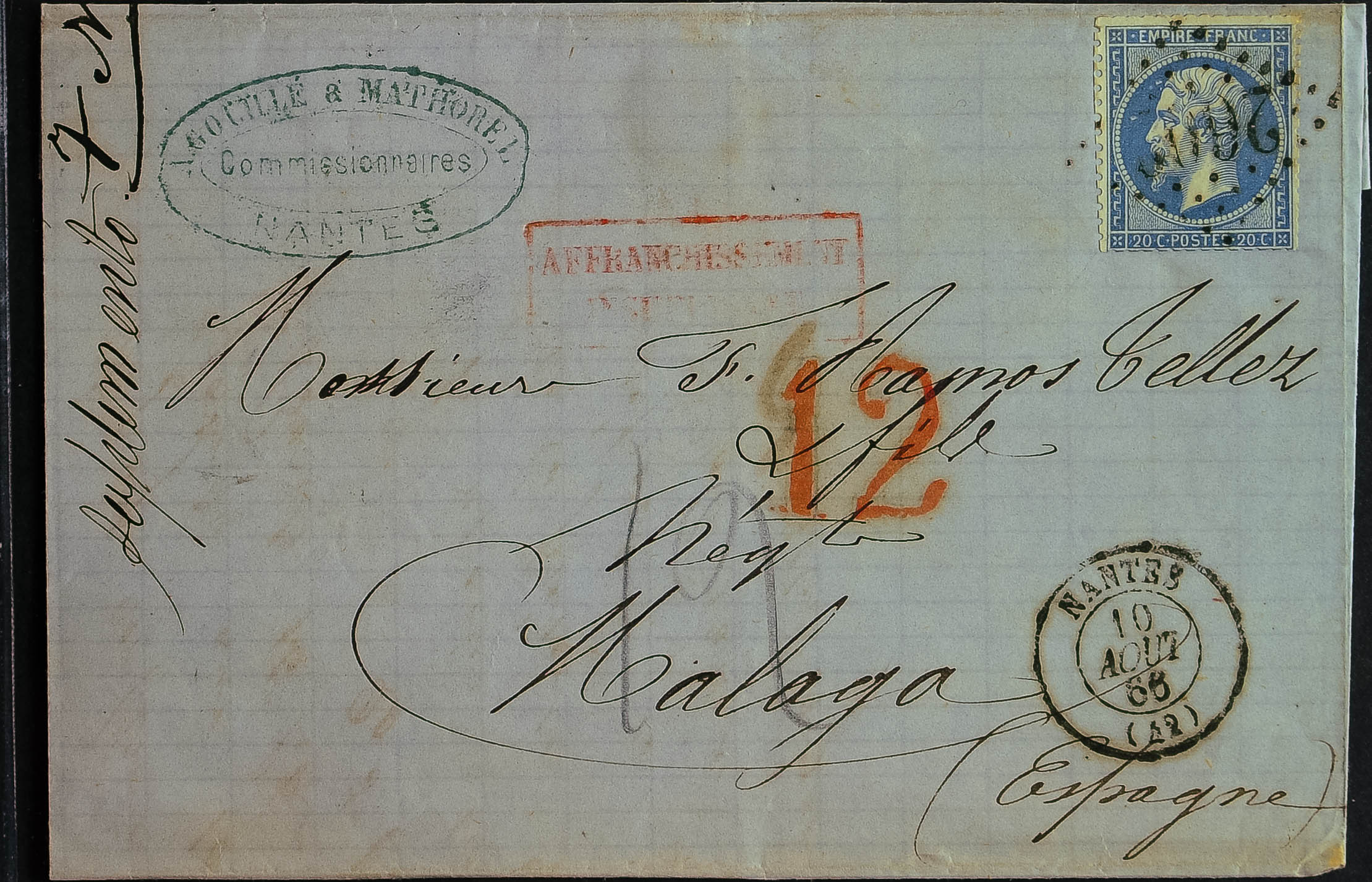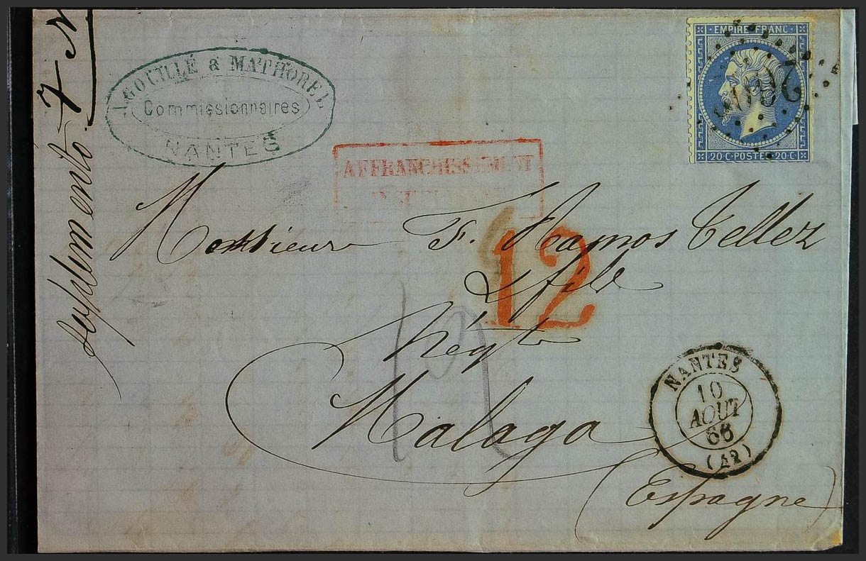 Yvert 22. 1866. 20 cts azul. NANTES a MALAGA. Matasello ROMBO DE CIFRAS GRANDES Nº2602 y en el frente marca AFFRANCHISSEMENT / INSUFFISANT y porteo de entrada "12", en rojo. MAGNIFICA.