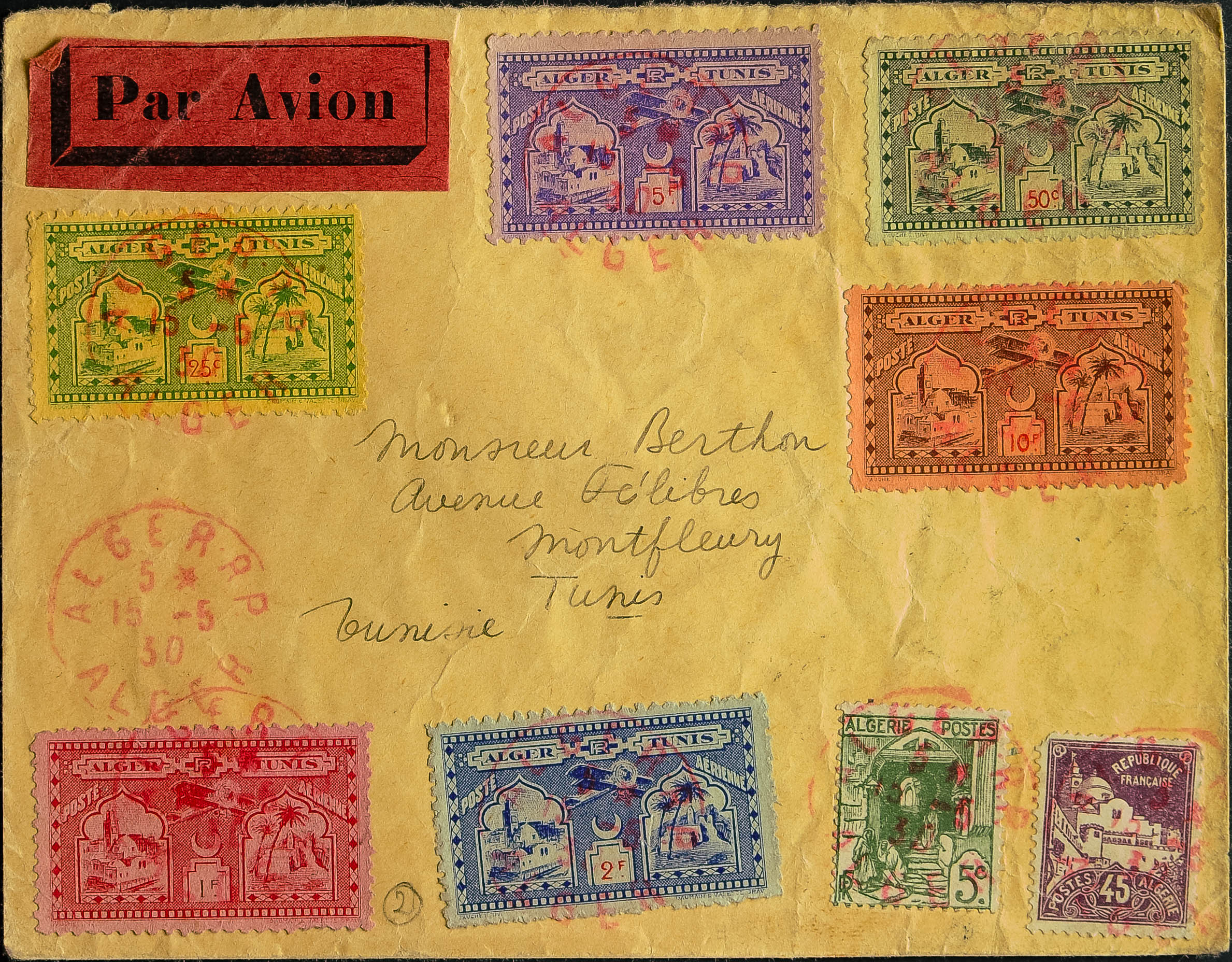 Yvert 37, 46. 1930. 5 cts verde, 45 cts violeta castaño y serie completa de viñetas ALGER-TUNIS. ARGEL a TUNEZ. Matasello ARGEL R.P. / ALGER, en rojo y al dorso llegada. MAGNIFICA.