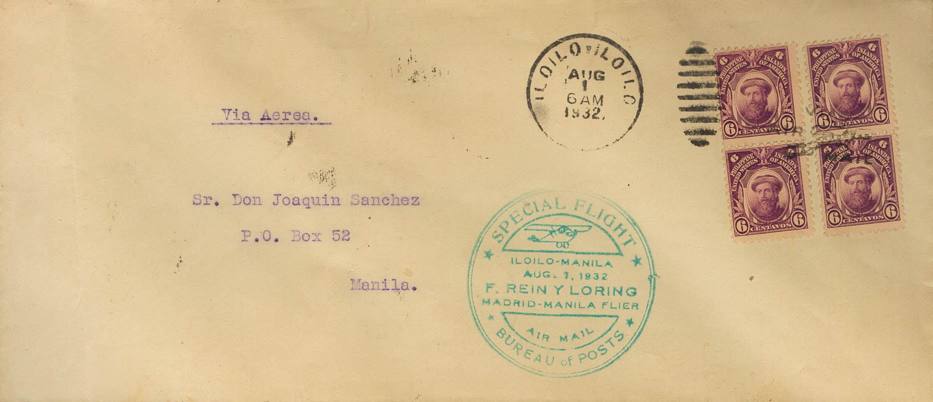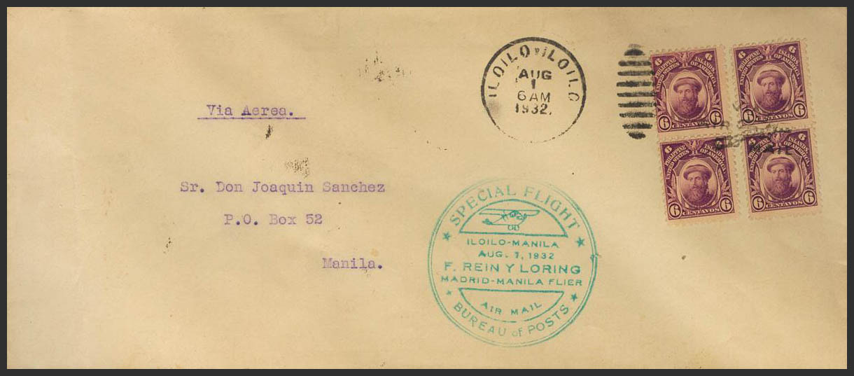 Yvert 206(4). 1932. 6 ctvos violeta, cuatro sellos. ILOILO a MANILA. En el frente marca SPECIAL FLIGHT / ILOILO-MANILA / F.REIN Y LORING / MADRID-MANILA FLIER / BUREAU OF POST, en azul y al dorso llegada. MAGNIFICA.