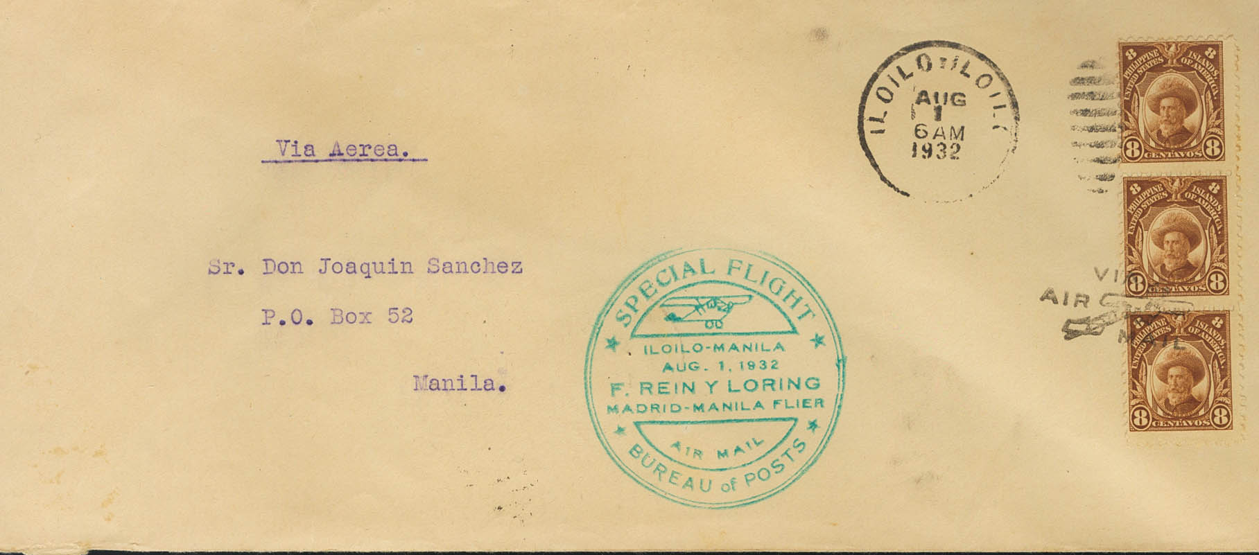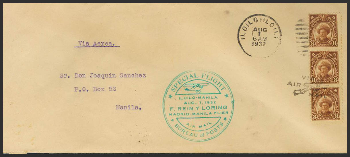 Yvert 207(3). 1932. 8 ctvos castaño, tres sellos. ILOILO a MANILA. En el frente marca SPECIAL FLIGHT / ILOILO-MANILA / F.REIN Y LORING / MADRID-MANILA FLIER / BUREAU OF POST, en azul y al dorso llegada. MAGNIFICA.