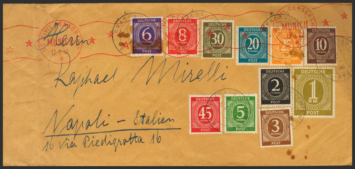 1947. 2 p, 3 p, 5 p, 6 p, 8 p, 10 p, 20 p, 25 p, 30 p, 45 p y 1 m. GRASSAU a NAPOLES (ITALIA). Matasello GRASSAU / (CHIEMGAU) y tránsito U.S. CIVIL CENSORSHIP / MUNICH, en rojo y al dorso llegada. MAGNIFICA.