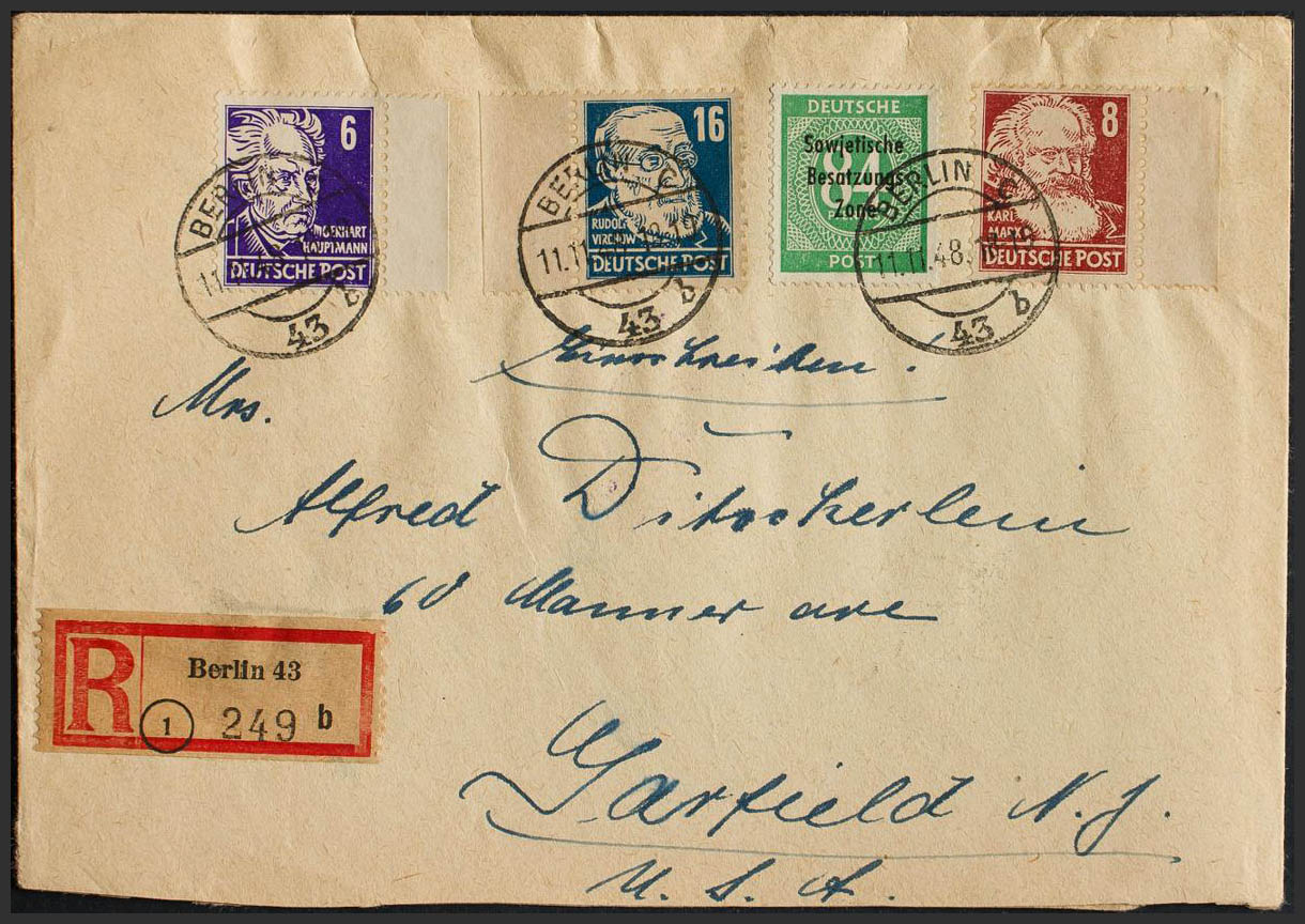 Yvert 33, 34, 38, 7. 1948. 6 p violeta, 8 p castaño rojo, 16 p azul y 84 p verde. Certificado de BERLIN a GARFIELD (U.S.A.). Al dorso llegada. MAGNIFICA.