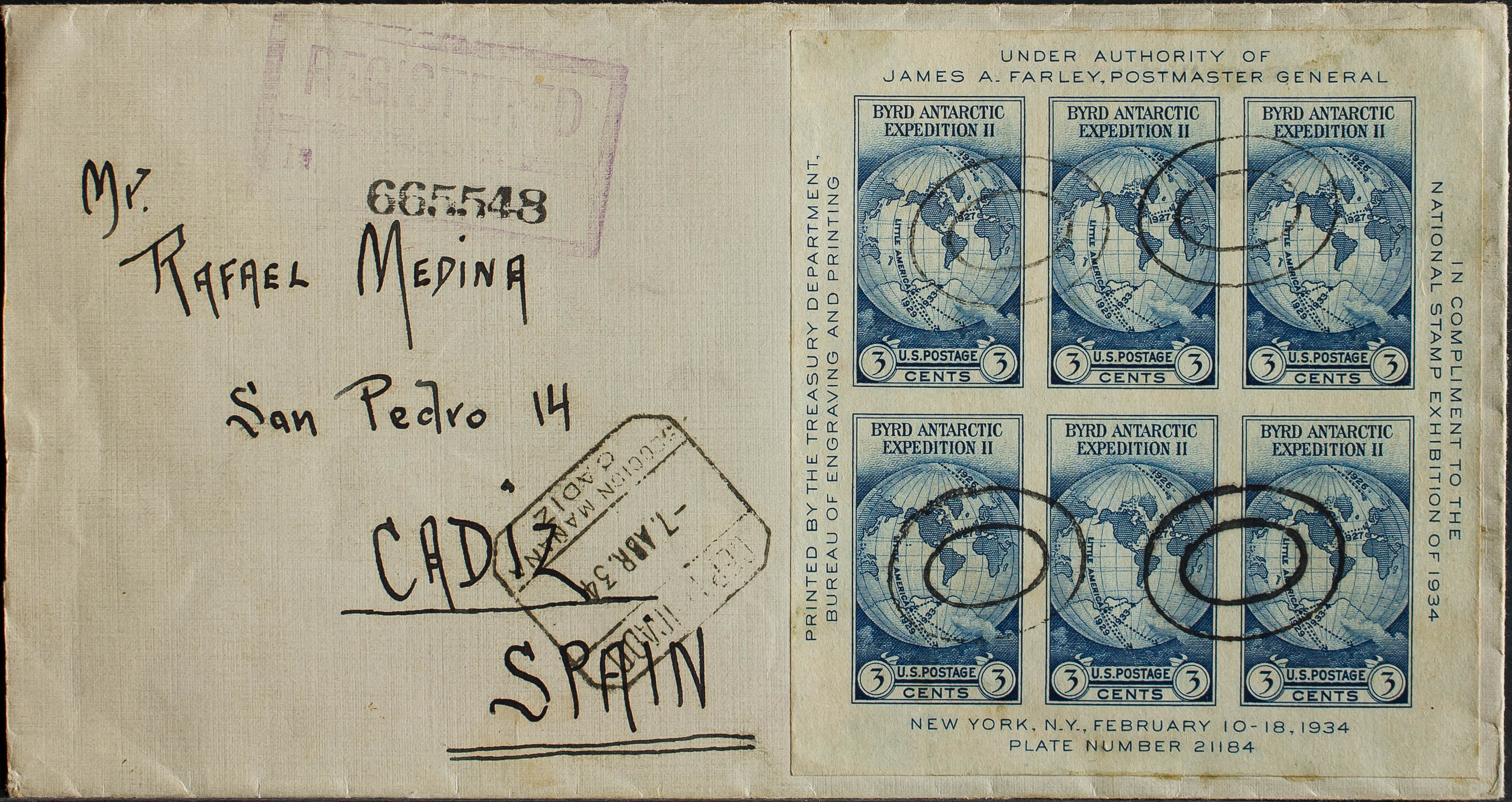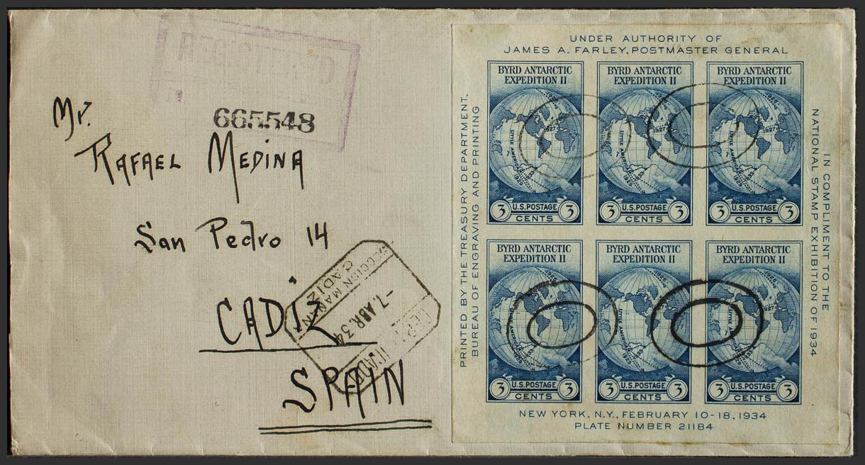 Yvert 3. 1934. 3 cts azul hoja bloque. Certificado de NUEVA YORK a CADIZ. En el frente llegada. MAGNIFICA.