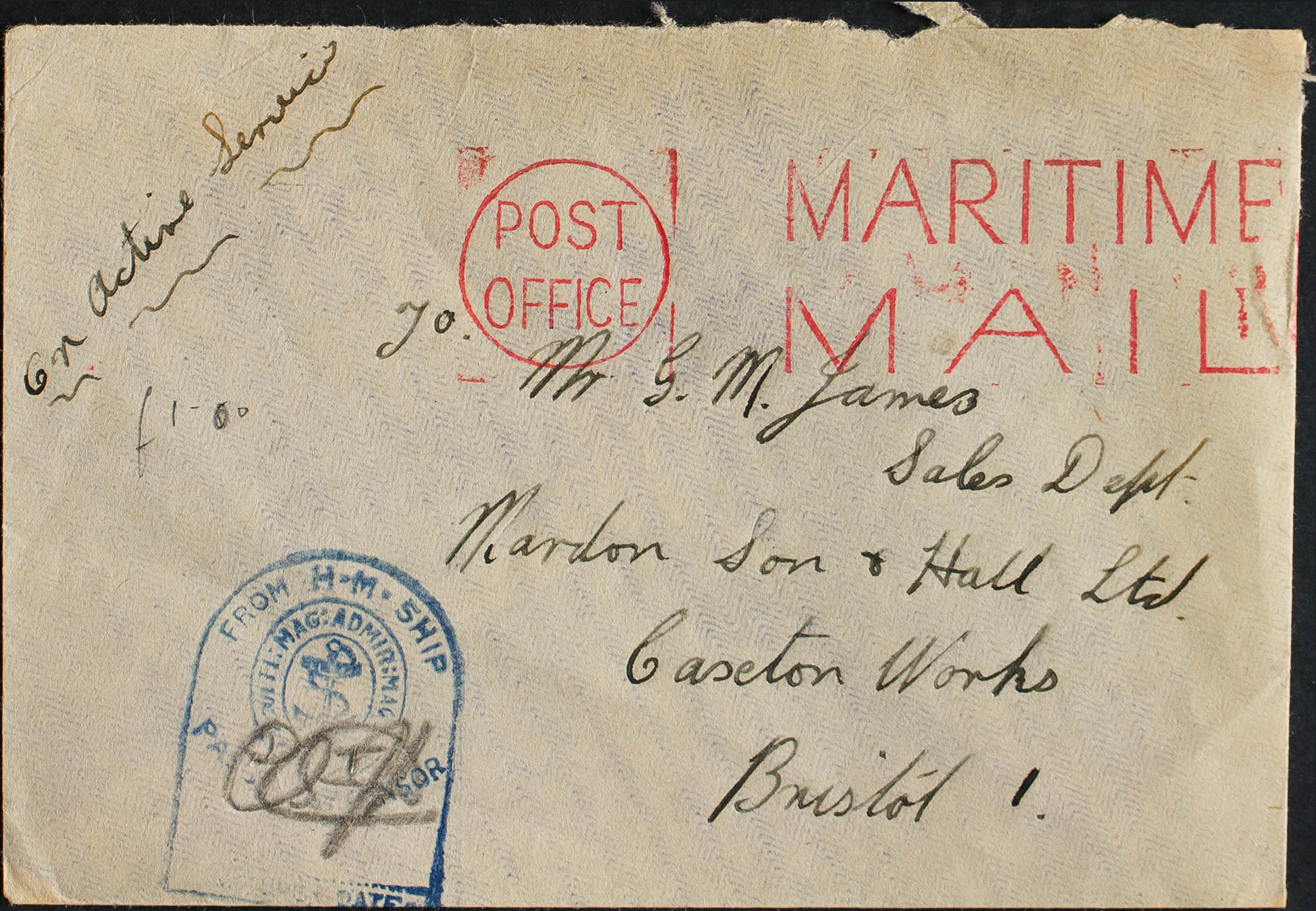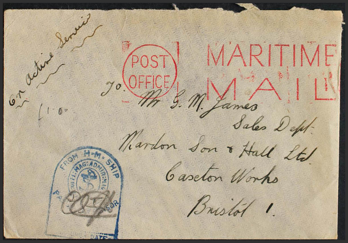 (1930ca). Dirigida a BRISTOL. Rodillo POST / OFFICE / MARITIME / MAIL, en rojo y marca FROM H.M. SHIP / PASED BY CENSOR, en azul. MAGNIFICA.