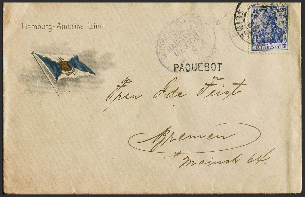 1906. 20 p ultramar. Sobre de la linea América-Hamburgo de MEXICO a BREMEN. Matasello DEUTSCHE SEEPOST / LINIE / HAMBURG / MEXICO, en violeta y fechador de tránsito ST.NAZAIRE. MAGNIFICA Y RARA.