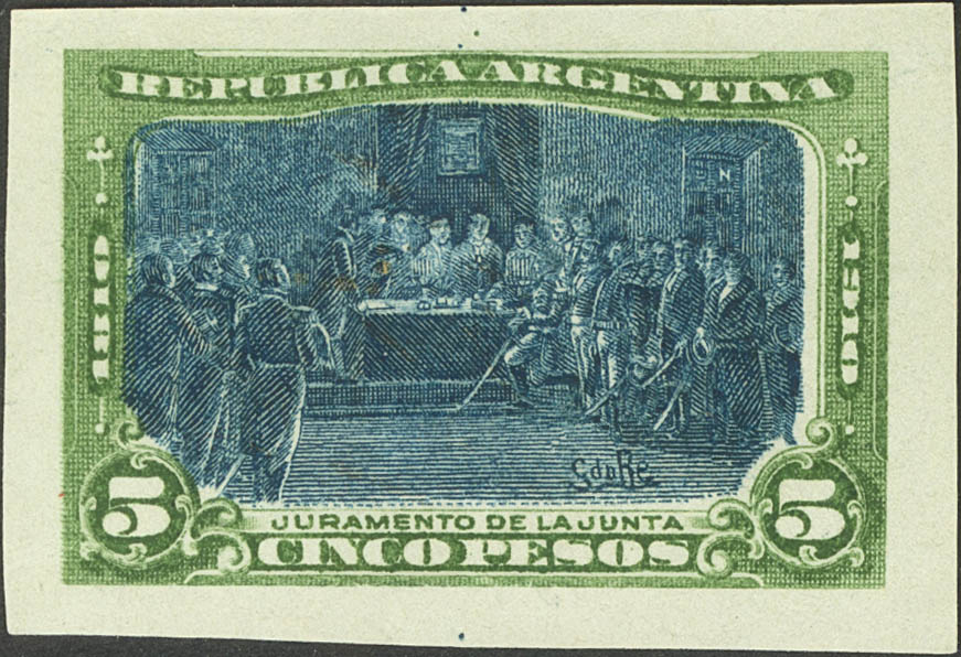 (★)Yvert 161P(5). 1910. Conjunto de cinco ENSAYOS DE COLOR (sin dentar) del valor de 5 pesos (Juramento de la Junta), en diferentes colores. MAGNIFICOS.