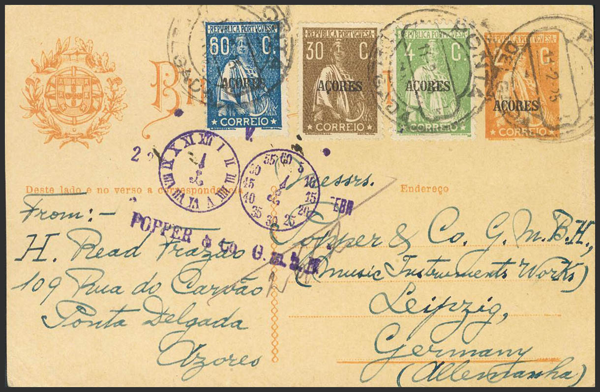 Yvert 164, 183, 187. 1925. 2 cts naranja sobre Tarjeta Entero Postal de PUNTA DELGADA a LEIPZIG (ALEMANIA), con franqueo complementario de 4 cts verde, 30 cts castaño y 60 cts azul. En el frente fechador especial tipo "Reloj" POPPER AND Cº, en violeta. MAGNIFICA.