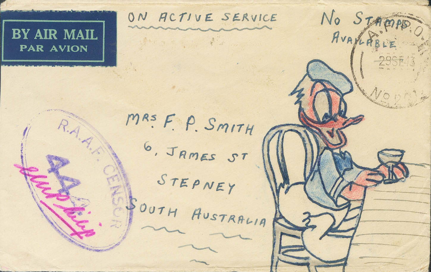 1943. Dirigida a STEPNEY, sobre con dibujo a mano del "Pato Donald". Manuscrito "No Stamp Available", fechador A.F.P.O. y marca de censura R.A.A.F. CENSOR / 444 (Royal Australian Air Force). MAGNIFICA Y RARA.