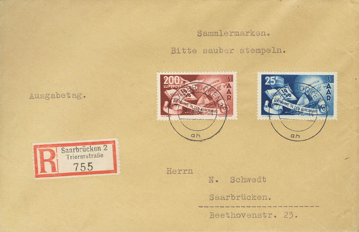 Yvert 277, Aéreo 13. 1950. Serie completa. Sobre de Primer DÃa Certificado. MAGNIFICO Y MUY RARO. (Michel 297/98, 1.900 Euros)