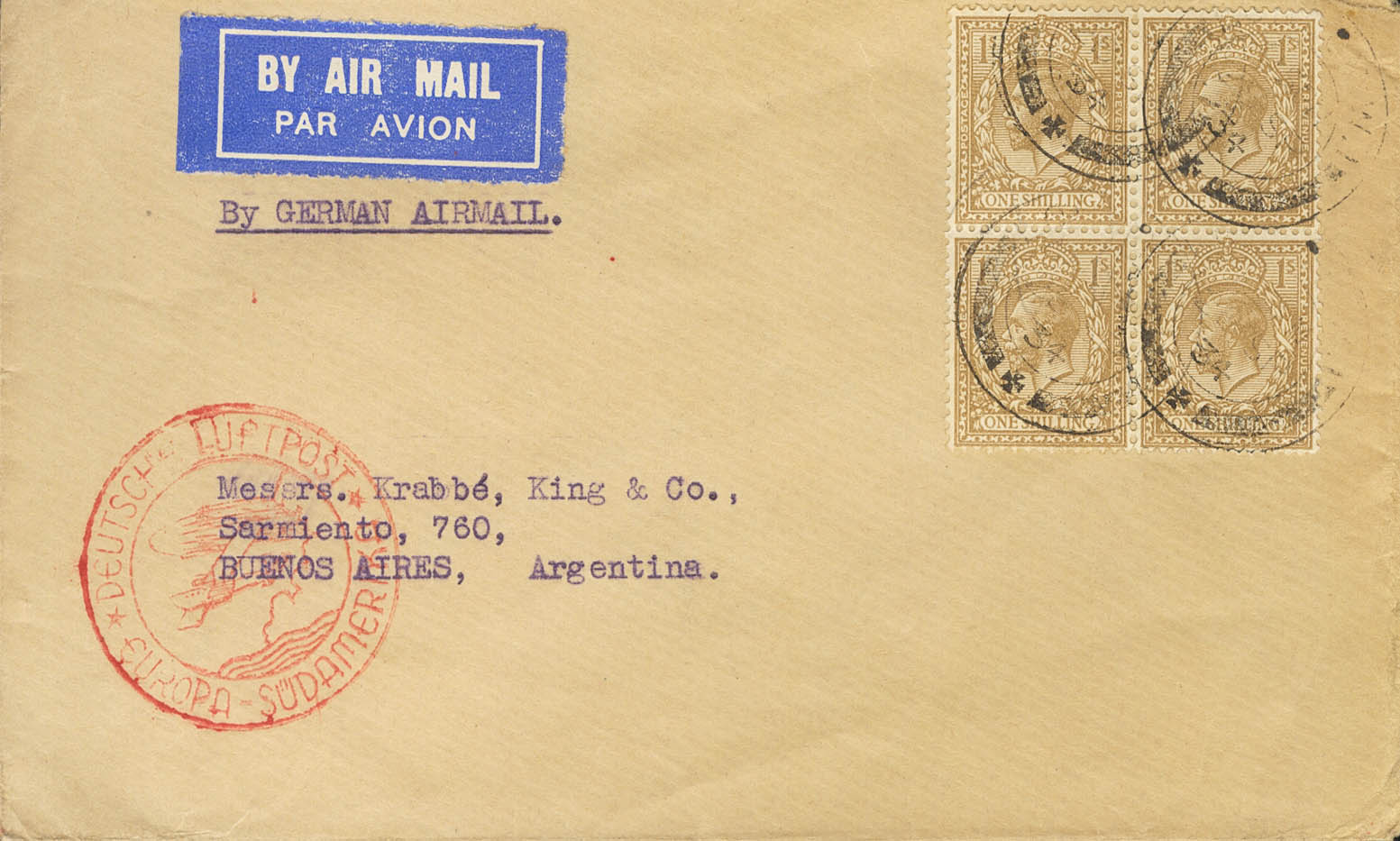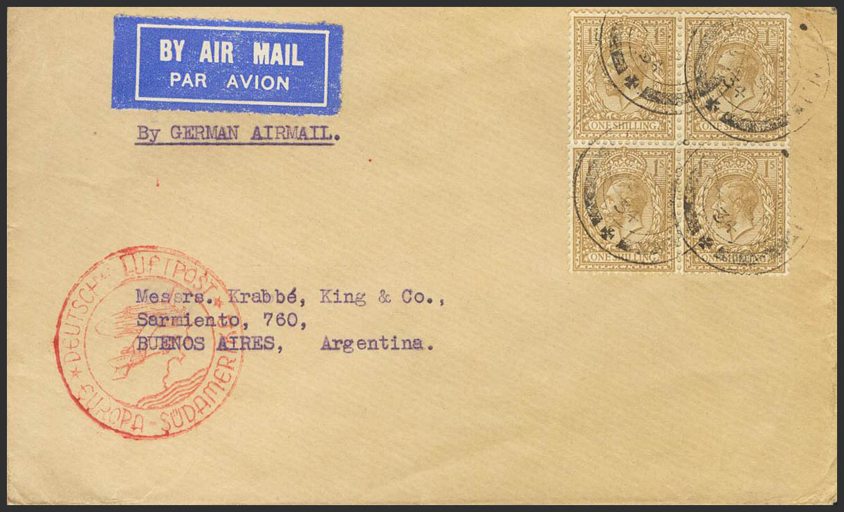 Yvert 152(4). 1934. 1 s bistre, bloque de cuatro. Correo Aéreo de LONDRES a BUENOS AIRES (ARGENTINA), circulada por correo aéreo Alemán. En el frente marca DEUTSCHE LUFTPOST / *EUROPA-SUDAMERIKA *, en rojo y al dorso llegada. MAGNIFICA.