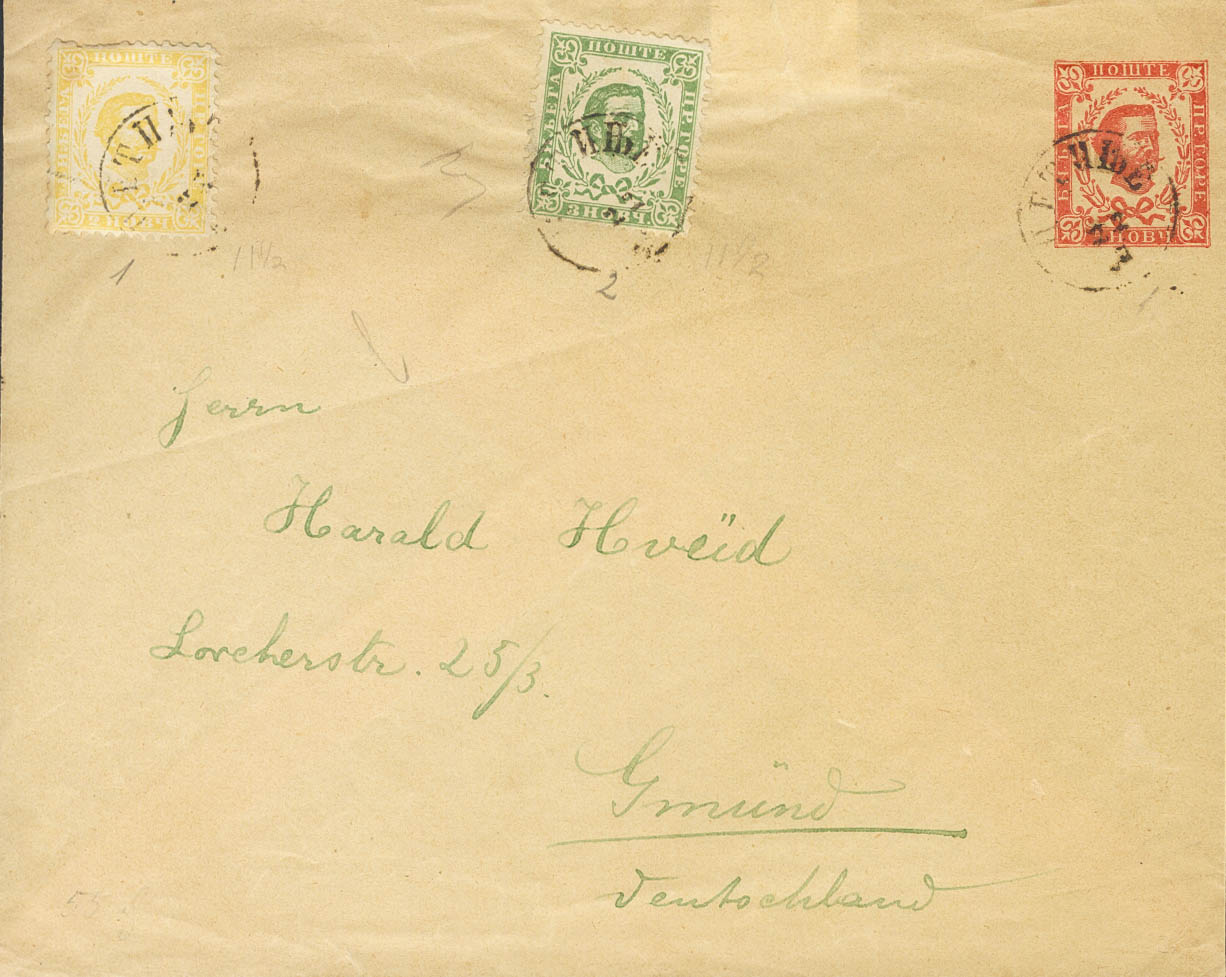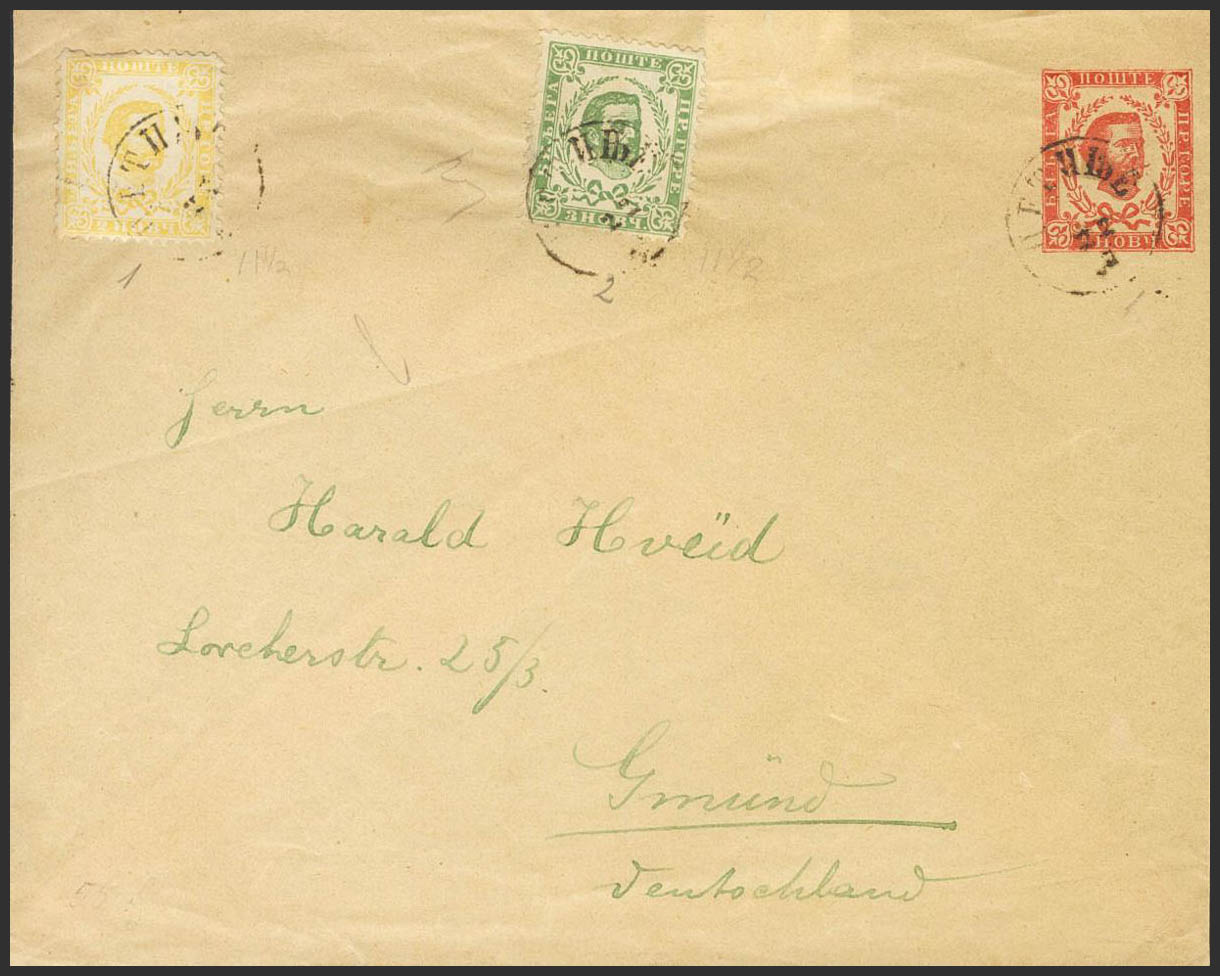 Yvert 8A, 9A. (1889ca). 5 n rojo sobre Entero Postal de CETTIGNE a GMUND (ALEMANIA), con franqueo complementario de 2 n amarillo y 3 n verde. MAGNIFICO Y RARO.