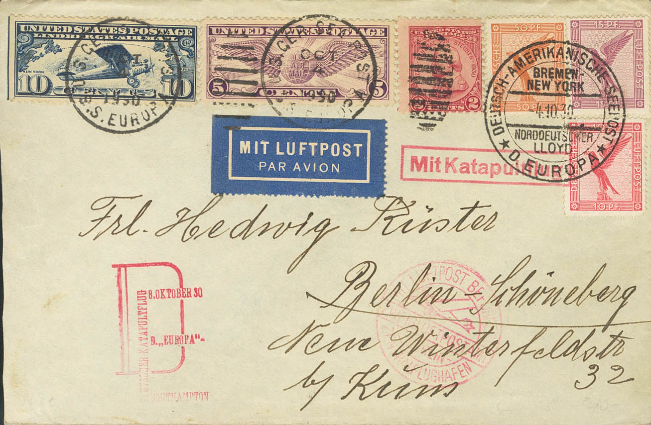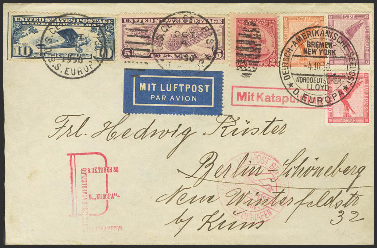 Yvert 28, 29, 31. 1930. 10 p rojo, 15 p lila, 50 p naranja y sellos de Estados Unidos de 2 ctvos, 5 ctvos y 10 ctvos. Correo Aéreo CATAPULTADO DESDE EL BUQUE ALEMAN EUROPA dirigido a BERLIN. Matasello DEUTSCH-AMERICANISCHE SEEPOST / BREMEN / NEW YORK / D.EUROPA y en el frente marcas MIT KATAPULTFLUG y DEUTSCHER KATAPULTFLUG / D.EUROPA / SOUTHAMPTON, ambas en rojo y al dorso llegada. MAGNIFICA Y RARA.