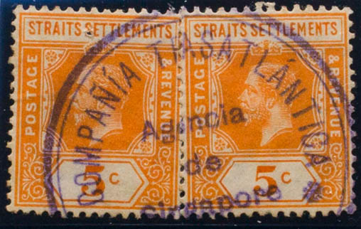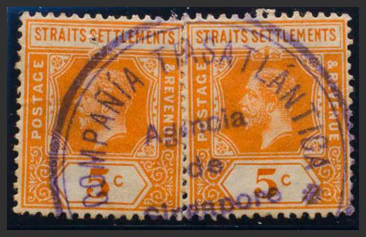 Yvert 141(2). 1912. 5 cts naranja, dos sellos. Matasello COMPAÑIA TRANSATLANTICA / AGENCIA / DE / SINGAPORE, en violeta. MAGNIFICO Y RARISIMO MATASELLO DE UNA COMPAÑIA TRANSATLANTICA ESPAÑOLA.